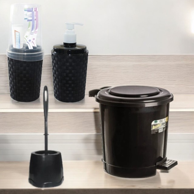 TOALETE LIXEIRA 07 LITROS PEDAL PRETA ESCOVA SANITARIA SUPER REFORÇADA PORTA ESCOVA RATTAN PORTA SABONETE LIQUIDO RATTAN