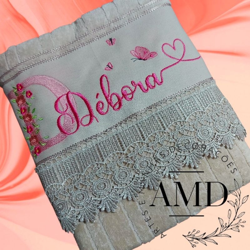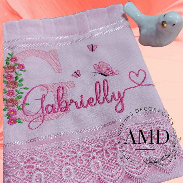 Toalha BANHO personalizada com nome, flores, borboletas Barrado em guipir Artes e Manhas Decorações