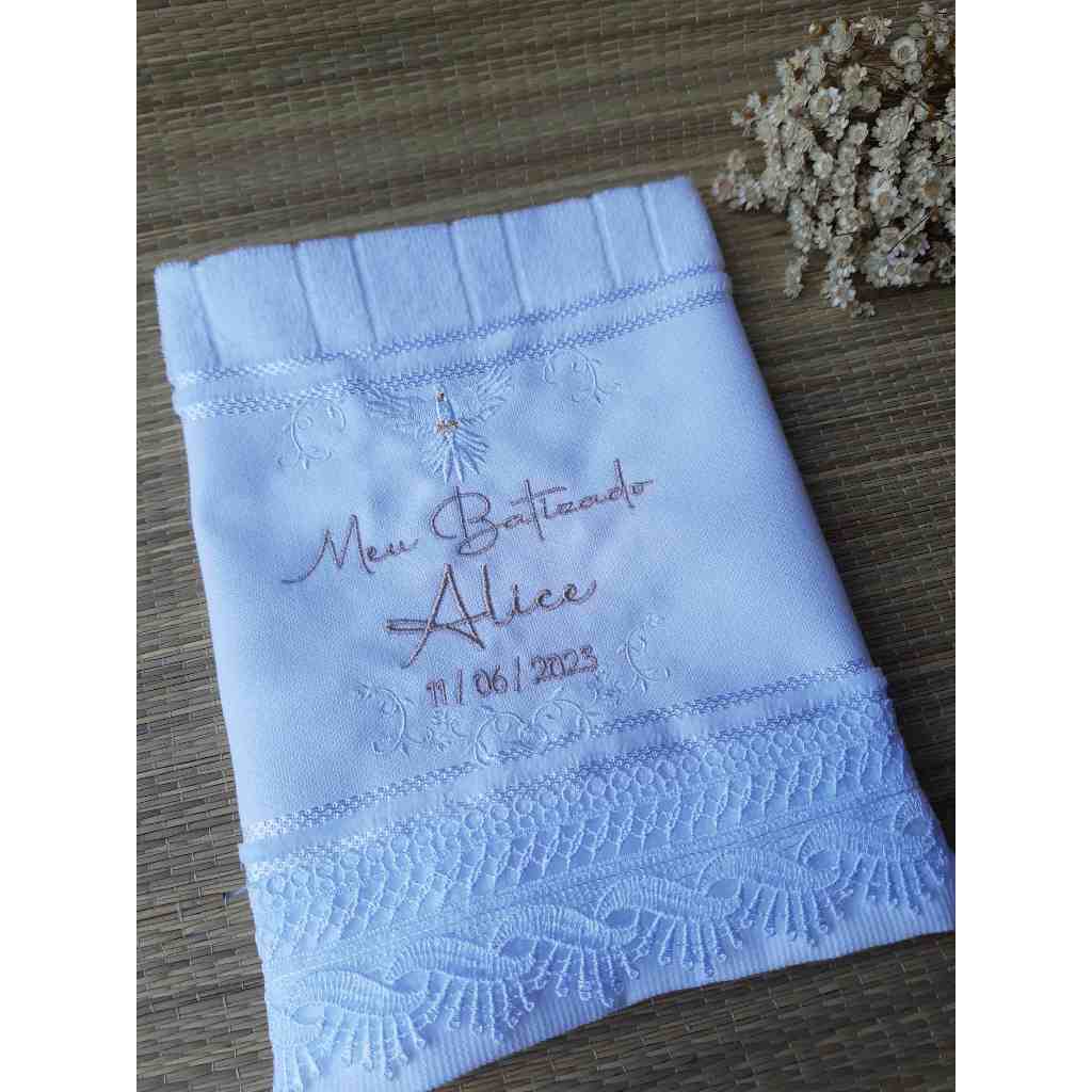 Toalha bordada para batizado tamanho Lavabo 30x45, Rosto 50x80 ou banho 70x140. Você pode colocar nome, data, alterar a cor. Envia no chat ou campo de mensagens no momento da compra. Trabalhamos com a toalha Dohler Linha Artesanalle. Para acrescentar oração consultar valores no chat.