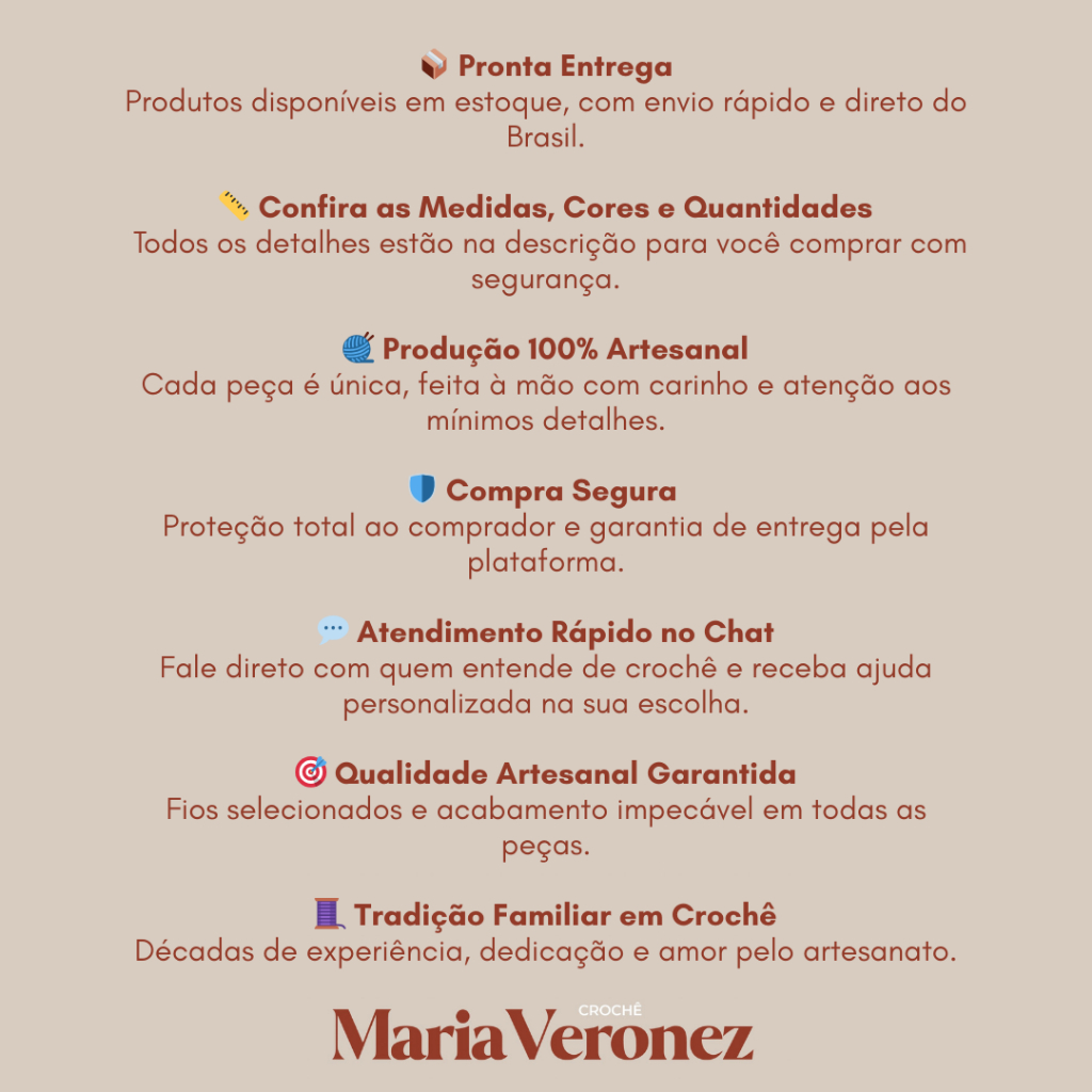 Adicione um toque artesanal e charmoso à sua decoração com esta toalha de mesa feita à mão. Com design redondo e delicado, é perfeita para mesas menores ou para compor a decoração de diferentes ambientes, trazendo elegância e praticidade. Especificações: • Dimensões: 60cm (diâmetro) • Composição: 100% Polipropileno • Feito à mão Informações Adicionais: • Variação de Tamanho: Por ser um produto artesanal, pode haver pequenas variações de até 5cm para mais ou para menos. • Sensível ao Calor: O polipropileno não suporta altas temperaturas. Evite apoiar objetos quentes para preservar a peça. • Diferença de Tonalidade: As cores podem apresentar leve variação em relação às imagens, devido às configurações de brilho e cor das telas de dispositivos eletrônicos. Disponibilidade: Pronta Entrega Envio Imediato Enviamos para todo o Brasil Aqui você compra diretamente de quem fabrica, garantindo qualidade artesanal e atendimento personalizado. Cada peça é feita com cuidado e paixão, carregando a tradição e exclusividade do nosso crochê.
