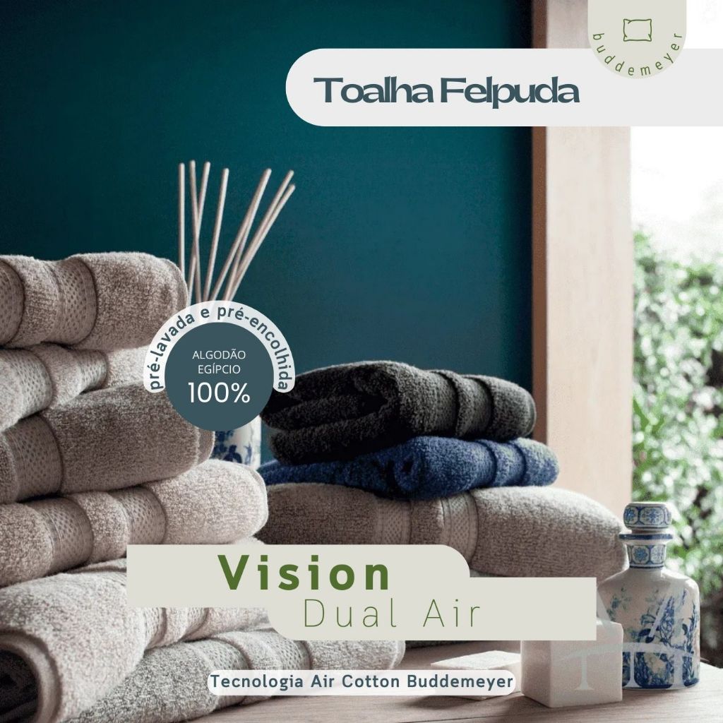 DescriçãoToalha Vision Dual Air Buddemeyer. Volumosa, extremamente macia e surpreendentemente leve, possui a delicada suavidade do puro algodão. Com design clean e refinado, o modelo tem elegante acabamento nas barras. Confere alta capacidade de absorção, oferecendo maciez, toque delicado e volume acentuado, além de brilho natural que realça as cores.Criada com tecnologia Air Cotton, a Toalha Vision Dual Air tem altíssima capacidade de absorção e secagem mais rápida. Feita em fios aerados, possui toque diferenciado, com conforto extra, promovendo as melhores experiências sensoriais no pós-banho.Características:- Tecnologia Air Cotton Buddemeyer- Toalha pré-lavada e pré-encolhida, conferindo durabilidade e alta capacidade de absorção- Composição: 100% Algodão- Qualidade e design BuddemeyerInstruções de Cuidado:Lave antes de usar. Cores escuras devem ser lavadas separadas das cores claras. Lavar em água fria ou em temperatura de até 60°C. O melhor sabão para manter as características do produto é o de coco ou neutro. Não colocar sabão diretamente no produto. Evite produtos a base de cloro, eles atacam o corante dos tecidos. Não exagere no uso de sabão em pó e use pouco amaciante. Permite secadora em temperatura baixa. Temperatura máxima da base do ferro 110°C. Não usar ferro a vapor. Não lavar a seco.Conteúdo Embalagem:1 Toalha Banhão Banho Gigante Vision Dual Air 90x160cm Buddemeyer