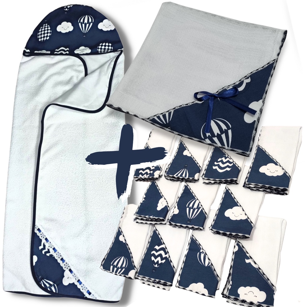 ** PRODUTO A PRONTA ENTREGA ** - OS KITS SÃO DA MESMA COR E ESTAMPA - Kit contendo 1 Toalha de Banho dupla camada com forro fralda e capuz, produzida em tecido felpudo e forrada em fralda 100% algodão, tecido super macio e absorvente, acompanha o bebê durante o crescimento, possui 80x80 cm, 6 unds do pano de boca para bebê, produzido com dupla camada de tecido fralda 100% algodão linha LUXO da marca Incomfral, perfeito para alimentação, higienização, amamentação do bebê e 1 unidade de manta fralda dupla camada 100% algodão 70x70 cm, tamanho ideal para realizar diversas atividades com o bebê, utilizar como forro, como mantinha, higienização do bebê, dentre outras atividades. Contém: - 1 unidade Toalha de Banho - 6 unidades Pano de Boca - 1 unidade Manta Fralda Composição: Toalha de Banho: - Dupla Camada - Parte externa - tecido felpudo - Parte inferna - forro fralda 100% Algodão - Detalhes em tecido estampado - Com capuz estampado e forrado - Com viés em toda a volta Pano de Boca: - Dupla camada tecido fralda - Tecido fralda 100% algodão linha LUXO - Acabamento em crochet - Detalhes em tecido estampado Pano de Boca: - Dupla camada tecido fralda - Tecido fralda 100% algodão linha LUXO - Acabamento em crochet - Detalhes em tecido estampado Medidas: Toalha de Banho: - 80x80 cm (pode haver pequena variação) Pano de Boca - 35x35 cm (pode haver pequena variação) Pano de Boca - 70x70 cm (pode haver pequena variação)