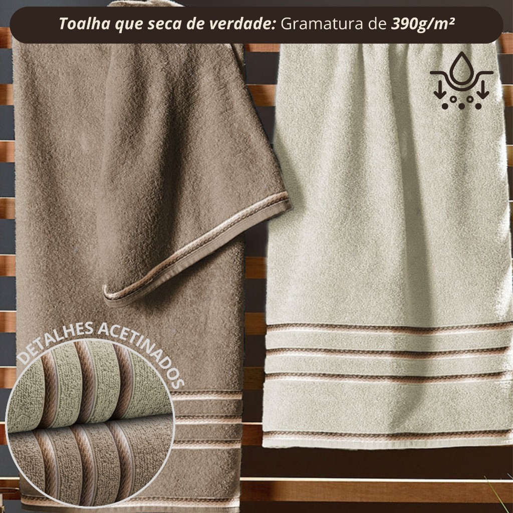 Toalha De Banho Classic Appel – Elegância e Conforto em Cada Fio Kit 2 Toalhas De Banho 2 Banho: 68cm X 1,35m Transforme seu banho em um ritual de conforto e sofisticação com a Toalha de Banho Grossa Classic Appel. Composta por 100% algodão de alta qualidade, essa toalha foi pensada para quem valoriza o toque suave na pele, o volume encorpado e a durabilidade de um produto premium. Com impressionantes 390g/m², ela oferece uma experiência felpuda e envolvente, ideal para os momentos em que você precisa desacelerar e se cuidar. O algodão puro garante alta absorção, mantendo você seco e confortável em poucos segundos, enquanto sua textura ultra macia proporciona uma sensação aconchegante ao toque. A barra acetinada é um detalhe à parte: traz um brilho discreto e elegante, que eleva o visual da toalha e confere um acabamento refinado ao ambiente. É o tipo de detalhe que transforma um item cotidiano em um verdadeiro artigo de luxo. Características que encantam: 🌿 100% Algodão – Fibra natural, macia, respirável e gentil com a pele. 💧 Alta Absorção – Secagem rápida e eficiente graças à gramatura superior. 🧵 390g/m² – Toalha encorpada, com peso ideal para oferecer volume sem perder a leveza no uso. ✨ Barra Acetinada – Um toque de classe que destaca a elegância do produto. 🛁 Felpuda e Super Macia – Sensação de conforto a cada uso. Ideal para: O seu pós-banho diário com mais aconchego. Compor enxovais elegantes e atemporais. Presentes que impressionam em datas especiais. Redescubra o prazer de sair do banho e se envolver em luxo, suavidade e qualidade. A Toalha Classic Appel é mais que uma toalha: é um carinho diário.