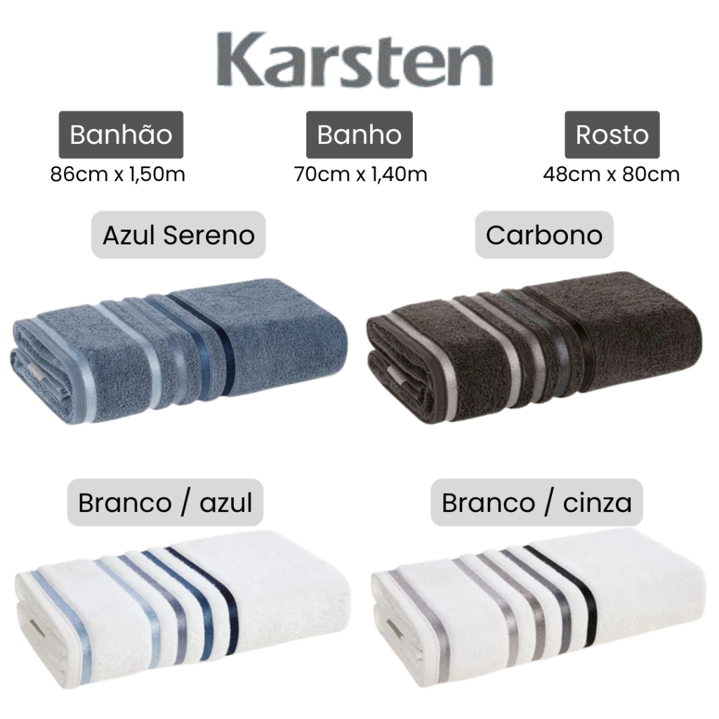 TOALHA DE BANHO KARSTEN LÚMINA Banhão, banho e rosto Surpreenda-se com a beleza e qualidade das Toalhas Karsten. Trazem o charme certo para a decoração do seu banheiro e conforto para a hora do banho. Escolha sua cor predileta e invista no seu bem estar. Toalha Felpuda Fio Penteado Gramatura: 500g/m2. Banhão: 86cm x 1,50m Banho: 70cm x 1,40m Rosto: 48cm x 80cm Composição: 98% algodão e 2% outras fibras.