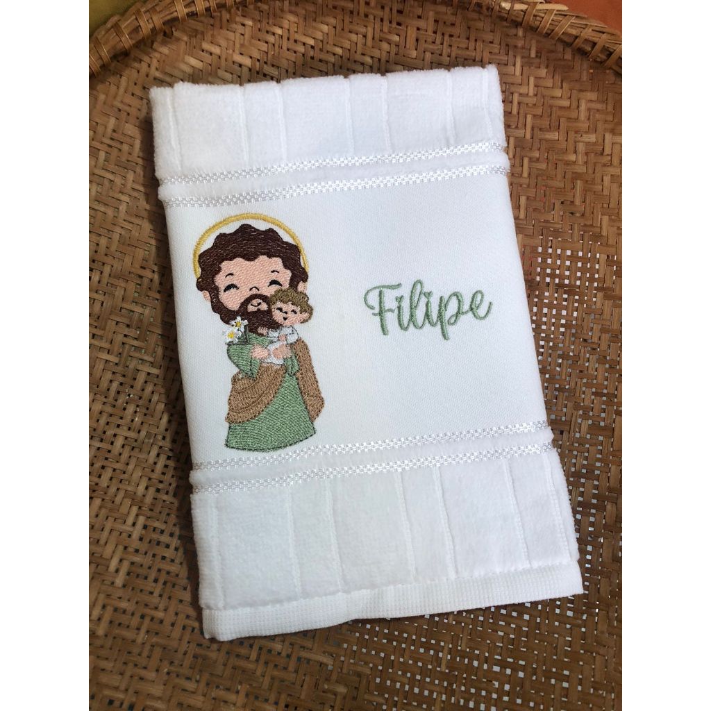 Toalha de mão bordada para lancheira escolar menino São José Jesus Menino com nome personalizado