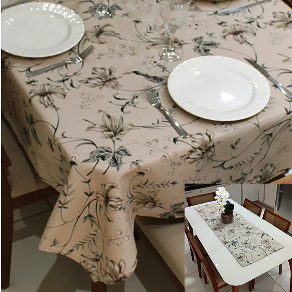 Toalha de Mesa 4 Lugares Quadrada + Caminho de Mesa em Tecido Linhão Rústico Floral Cinza