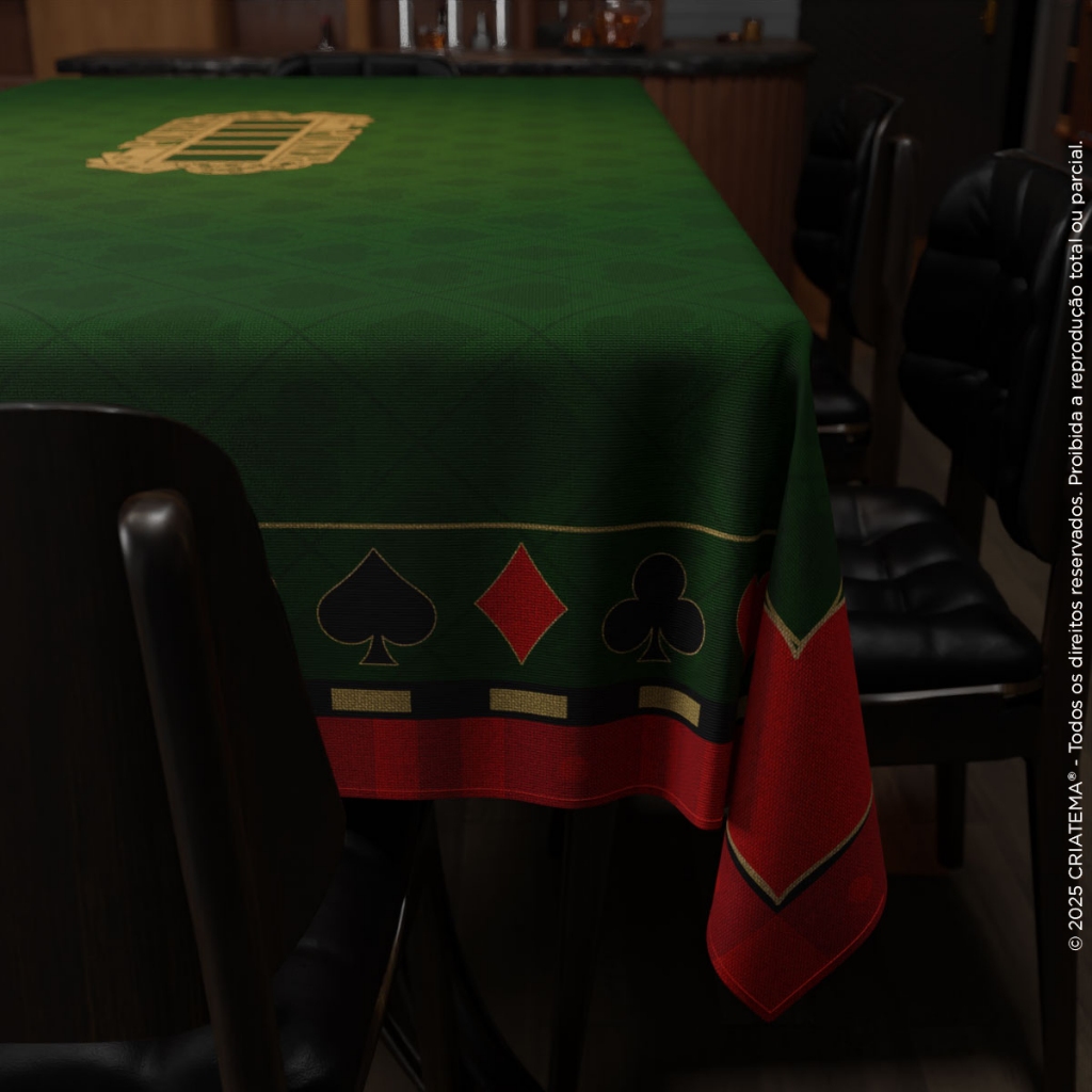 Se você é apaixonado por jogos de cartas e valoriza uma experiência de alto nível, nossa Toalha de Mesa é a escolha perfeita. Com um design sofisticado e estampa temática, ela transforma qualquer ambiente em um verdadeiro cenário de cassino. Seu tecido aveludado de alta qualidade proporciona um toque macio e um deslize suave para as cartas, garantindo partidas mais dinâmicas e profissionais. Ideal para Poker, Truco e outros jogos, essa toalha eleva o seu jogo com estilo e praticidade. Reúna os amigos, eleve o jogo e transforme cada rodada em um grande momento. >> MEDIDA DA TOALHA: TAMANHO ÚNICO: Toalha Retangular: 1,50m de largura por 2,20m de comprimento. >> DICAS DE USO: Perfeitas para utilização em mesas retangulares ou quadradas. Coloque a toalha sobre a mesa, transformando em um verdadeiro cenário de jogos. >> ITEM INCLUSO: 1 Toalha de mesa para jogos >>> TODOS OS PRODUTOS NÃO ACOMPANHAM MESA OU OBJETOS DECORATIVOS <<< >> FICHA TÉCNICA: • Tecido: Malha Aveludada Premium - Tecido grosso e com alta durabilidade • Gramatura: 240 g/m de excelente qualidade • Composição do Tecido: 100% Poliéster >> BENEFÍCIOS: • Deslize suave das cartas na mesa • Durabilidade comprovada • Acabamento de alto padrão • Mais diversão >> RECOMENDAÇÕES • Lavar preferencialmente à mão • Temperatura máxima na lavagem de 30°C • Não usar alvejante • Durabilidade garantida: não desbota • Para melhor conservação, secar à sombra • Não é necessário passar • Não lavar a seco • INFORMAÇÃO COMPLEMENTAR: As cores podem variar, devido às configurações brilho e contraste do monitor ou celular onde a imagem está sendo visualizada, também podem dar a impressão das cores serem mais ou menos vivas, mais ou menos intensas.
