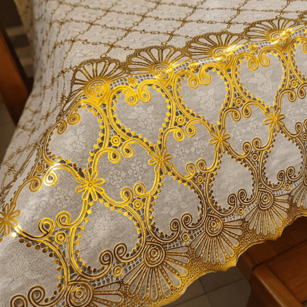 A Toalha de mesa metalizada é uma opção elegante e moderna para decorar a sua mesa. Uma excelente escolha para ocasiões especiais como festas, jantares formais, ceia de Natal e Reveillon. Além de ser, ao mesmo tempo, prática para uso diário, por conta da sua superfície brilhante e impermeável. Você vai se encantar! Ótima ideia para presentear aquela amiga que ama uma mesa posta! Fica a dica. Variações disponíveis: Ouro Gold Nobreza Bronze Silver Prata Flores Inverno Império Veneza Aura Siena Arabesco Dourada Medidas disponíveis (Largura X Altura): 1,37m X 1,40m 1,37m X 2,20m 1,37m X 2,50m 1,37m X 3,00m 1,37m X 4,00m Composição: 100% Policloreto de Vinila(PVC)