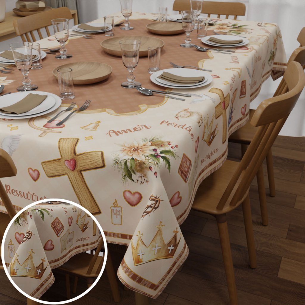 Toalha de Mesa Retangular Decorativa Páscoa Religiosa Cristã Em Oxford para Mesa Posta 1,40x2,10m