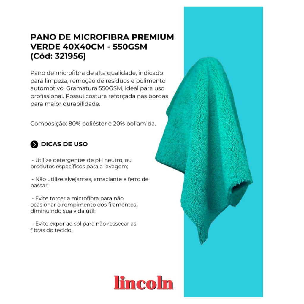 Toalha de Microfibra Premium Lincoln 40x40cm – 550GSM – Alto Desempenho em Detalhamento AutomotivoA Toalha de Microfibra Premium Lincoln 40x40cm com gramatura de 550GSM é uma excelente escolha para quem busca o máximo desempenho em acabamento automotivo. Desenvolvida com microfibra de altíssima qualidade, esta toalha proporciona um toque ultramacio, garantindo uma limpeza segura e eficaz, sem risco de causar arranhões ou micro riscos na pintura.Com 550 gramas por metro quadrado, a toalha possui uma gramatura elevada, ideal para tarefas que exigem alto poder de absorção e delicadeza ao mesmo tempo. Seu tamanho compacto de 40x40cm oferece praticidade e controle durante o uso, sendo perfeita para trabalhos de detalhamento, remoção de ceras, polidores, limpeza de painéis, cromados, vidros e superfícies sensíveis.A estrutura densa das fibras permite capturar sujeiras com mais eficiência, sem arrastar partículas pela superfície, o que aumenta a segurança durante a limpeza e o polimento. Além disso, seu acabamento premium confere maior durabilidade e resistência ao produto, que pode ser lavado e reutilizado diversas vezes sem perder suas características originais.Características principais:-Medidas: 40x40cm-Gramatura: 550GSM (alta densidade)-Composição: microfibra premium ultramacia-Excelente absorção e remoção de resíduos-Não risca, não solta fiapos e é altamente durável-Ideal para acabamento, remoção de ceras, limpeza interna, vidros e cromados-Produto lavável e reutilizávelIndispensável para profissionais da estética automotiva e apaixonados por cuidados com o carro, a toalha de microfibra Lincoln 550GSM é sinônimo de confiança, qualidade e eficiência. Um produto desenvolvido para quem exige os melhores resultados em cada detalhe.