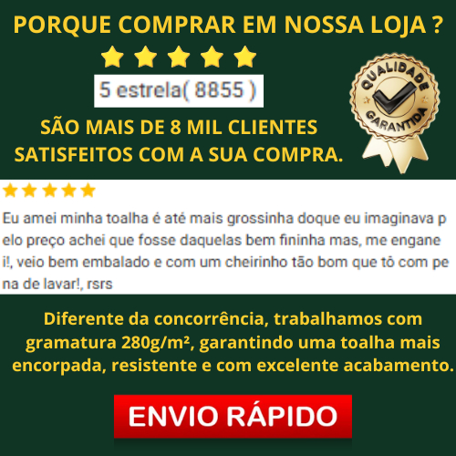 toque macio e cores vivas. Vendemos essa toalha em massa no Brasil. • Tamanho: 70cm x 140cm • Composição: 70% algodão 30%Poliéster • Peso aprox: 280g • Gostaria mais unidades? Nos informe que montamos um kit com condições especiais!