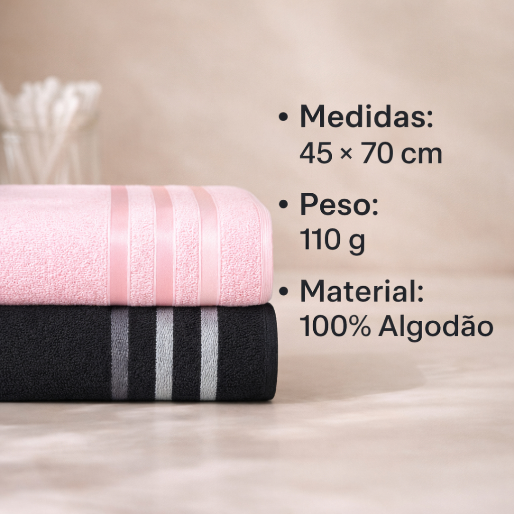 Toalha de Rosto Onix – 45x70 cm – 100% Algodão Descubra a sofisticação e o conforto da linha Onix, pensada para quem valoriza qualidade, durabilidade e elegância. Confeccionadas em 100% algodão, nossas toalhas de rosto oferecem alto poder de absorção e um toque macio incomparável. O diferencial está no barrado em fio rayon, com delicadas linhas que percorrem de uma lateral à outra, proporcionando um brilho sutil e sofisticado na mesma cor da toalha, valorizando qualquer ambiente, seja banheiro ou lavabo. ==== Especificações do Produto: = Composição: 100% Algodão (exceto detalhes decorativos) = Medidas: 45 x 70 cm = Peso: 110 g = Gramatura: 365 g/m² = Fio: 16/1 singelo – garante toque macio e delicado ==== Vantagens: = Produto à pronta entrega = Envio rápido e seguro = Estamos sempre à disposição para esclarecer qualquer dúvida e garantir a melhor experiência de compra. Atenciosamente, Equipe JY Toalhas