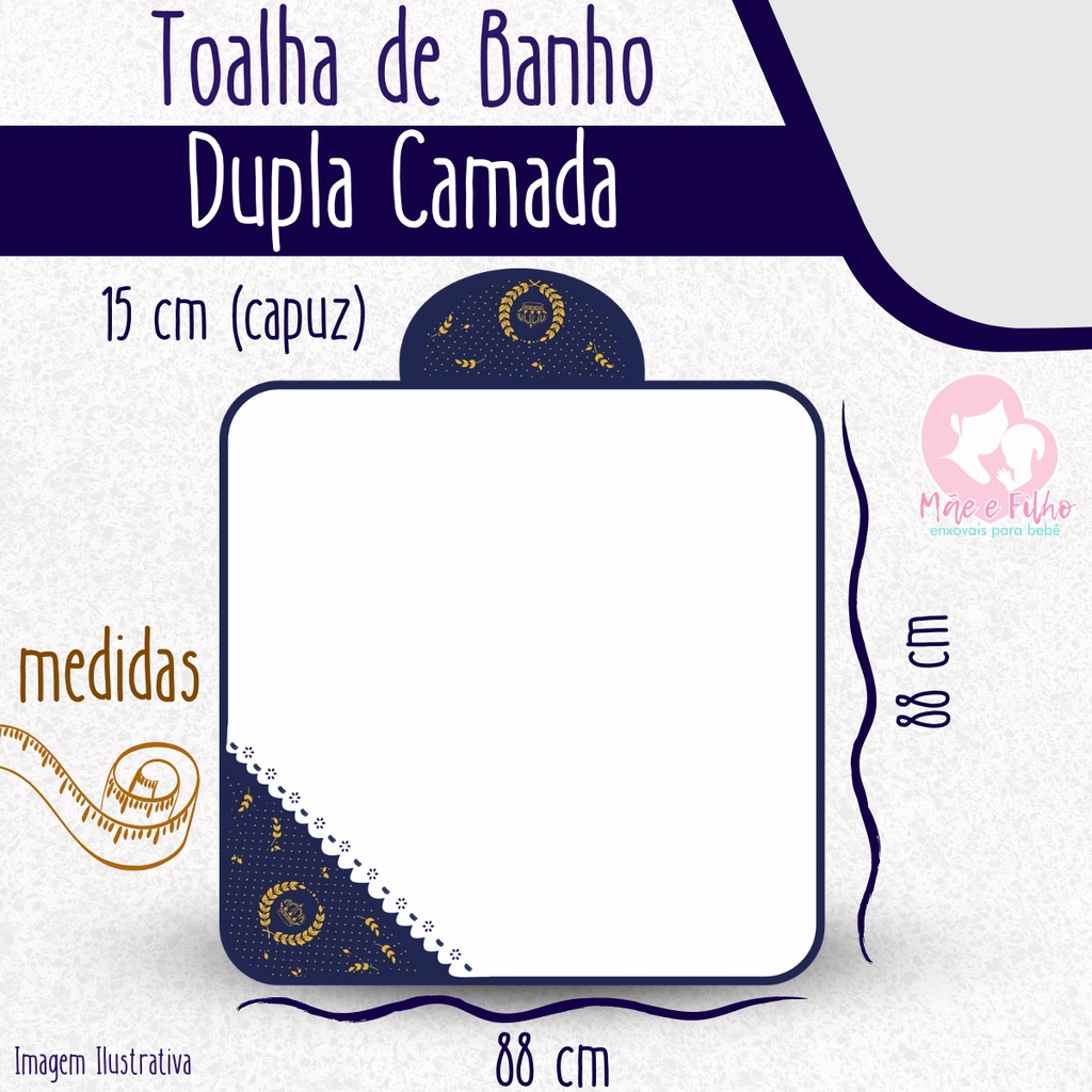 ** ENVIO IMEDIATO ** Nosso produto é fabricado em tecido ATOALHADO com acabamento estampado 100% algodão MODELO LUXO (maior maciez e durabilidade), com detalhes em passa fita de cetim, fino e delicado. Material antialérgico, lavável e atóxico. A Toalha Capuz possui medidas de 72x76 cm (aproximadamente), perfeito para cobrir todo o seu bebê, o deixando confortável e seco após o banho. Com tecido estampado e acabamentos em passa fita e fita de cetim, proporcionam um toque delicado à nosso produto. Contém: - 1 unidade Toalha de Banho Bebê com Capuz Forrada em Tecido Fralda 100% Algodão Tamanho: - Comprimento 72 cm (aprox) - Largura 76 cm (aprox) Composição: - Tecido Felpudo Atoalhado (tecido externo) - Forrada com Tecido Fralda 100% Algodão Antialérgico - Com viés em toda volta (evita desfilamentos) - Detalhe em passa fita e fita de cetim - Com capuz forrado e atoalhado PERGUNTAS FREQUENTES: QUAIS AS ESTAMPAS DISPONÍVEIS? - Todas no anúncio temos disponíveis; POSSO ESCOLHER MAIS DE UMA TOALHA? - Sim, no próprio anúncio você pode escolher a quantidade que desejar de toalhas e suas estampas; POSSUI FORRO? - Sim, o capuz e toalha são forradas com tecido fralda 100% algodão; QUAL ESTAMPA SERÁ ENVIADA? - A que escolher no ato da compra, selecionando a opção que deseja e adicionando ao carrinho; QUAL O TAMANHO? - 72x76 cm (aproximadamente); RECOMENDAÇÕES DE LAVAGEM - Delicada ou à mão.