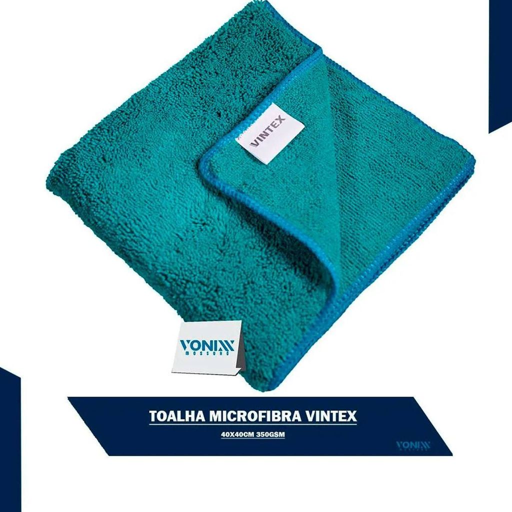 TOALHA MICROFIBRA 40X40CM 350GSM VINTEX A Toalha de Microfibra Vintex é indicada para limpeza de sujidades diversas, aplicação ou remoção de ceras e secantes, finalização de polimentos e acabamento. A composição de poliéster e poliamida evitam riscos na superfície. CARACTERÍSTICAS: - Tecido de alta durabilidade com composição de microfibras de poliéster e poliamida - Resultados superiores em comparação aos panos comuns - Indicado para limpeza automotiva e doméstica - Tecnologia inovadora com alto poder de absorção e remoção de sujeira - Remove camadas de ceras e polidores sem arranhar a pintura e proporciona acabamento excelente - Ideal para limpeza de vidros, espelhos, partes internas do veículo, pintura, faróis e cromados - Alta capacidade de absorção - Não solta fiapos - Dimensões: 40cm x 40cm - Gramatura: 350 GSM (gramas por metro quadrado)