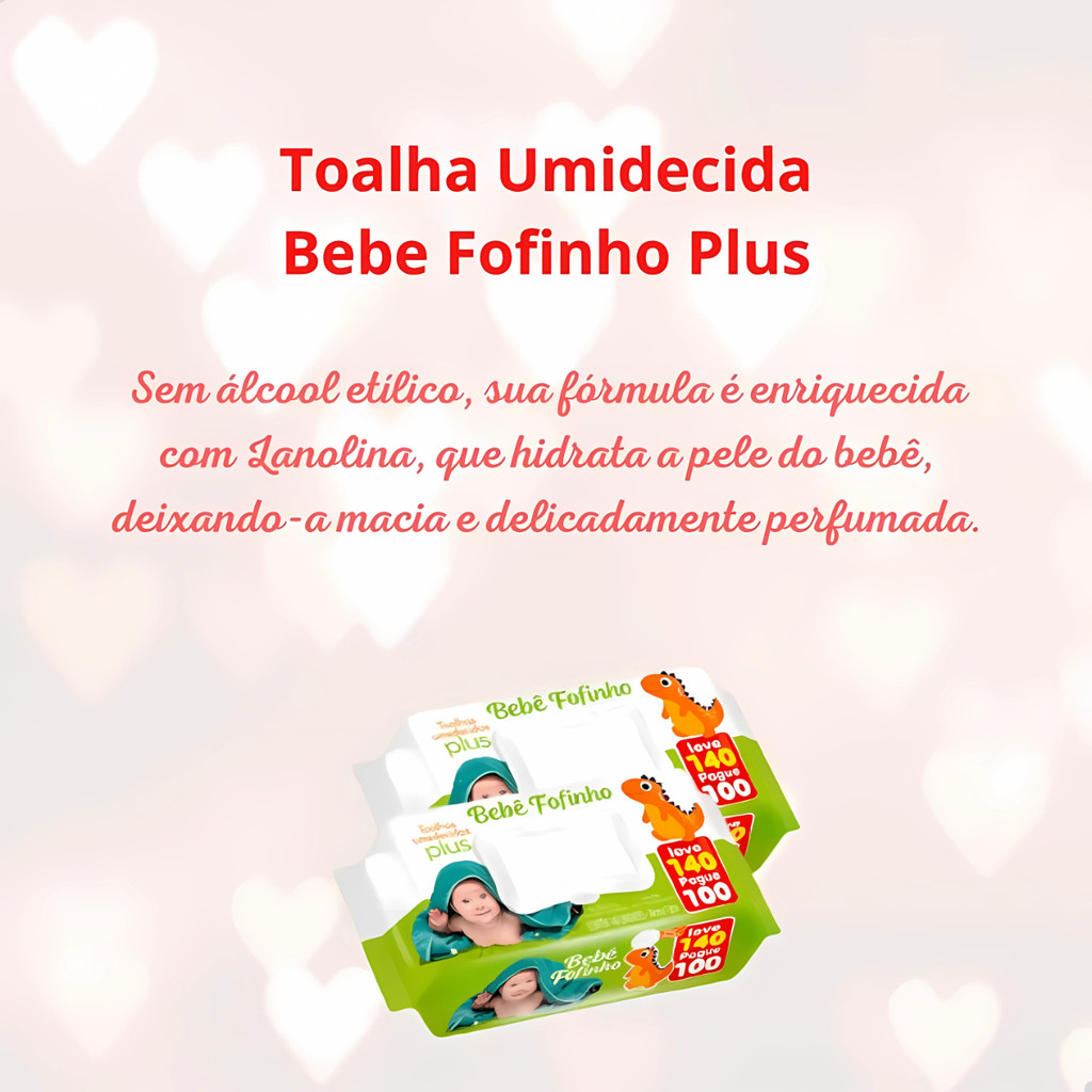 Toalha Umedecida Bebê Fofinho® Plus - 140 unidades: São ideais para cuidar da pele delicada do seu bebê. Livres de álcool e hipoalergênicas, garantem uma limpeza suave e segura. Marca: Bebê Fofinho Indicação: Bebês a partir do 1° dia de vida Necessidade: Higiene e Cuidados com o Bebê ESPECIFICAÇÕES: - Limpeza mais eficaz; - Umidade na medida certa; - Não contém álcool etílico; - Extrato natural de Alóe Vera; - Limpeza e hidratação da pele do bebê; - Dermatologicamente testado e hipoalergênico. O QUE VEM INCLUSO? 1 Toalha Umedecida Bebê Fofinho Plus - 140 unidades