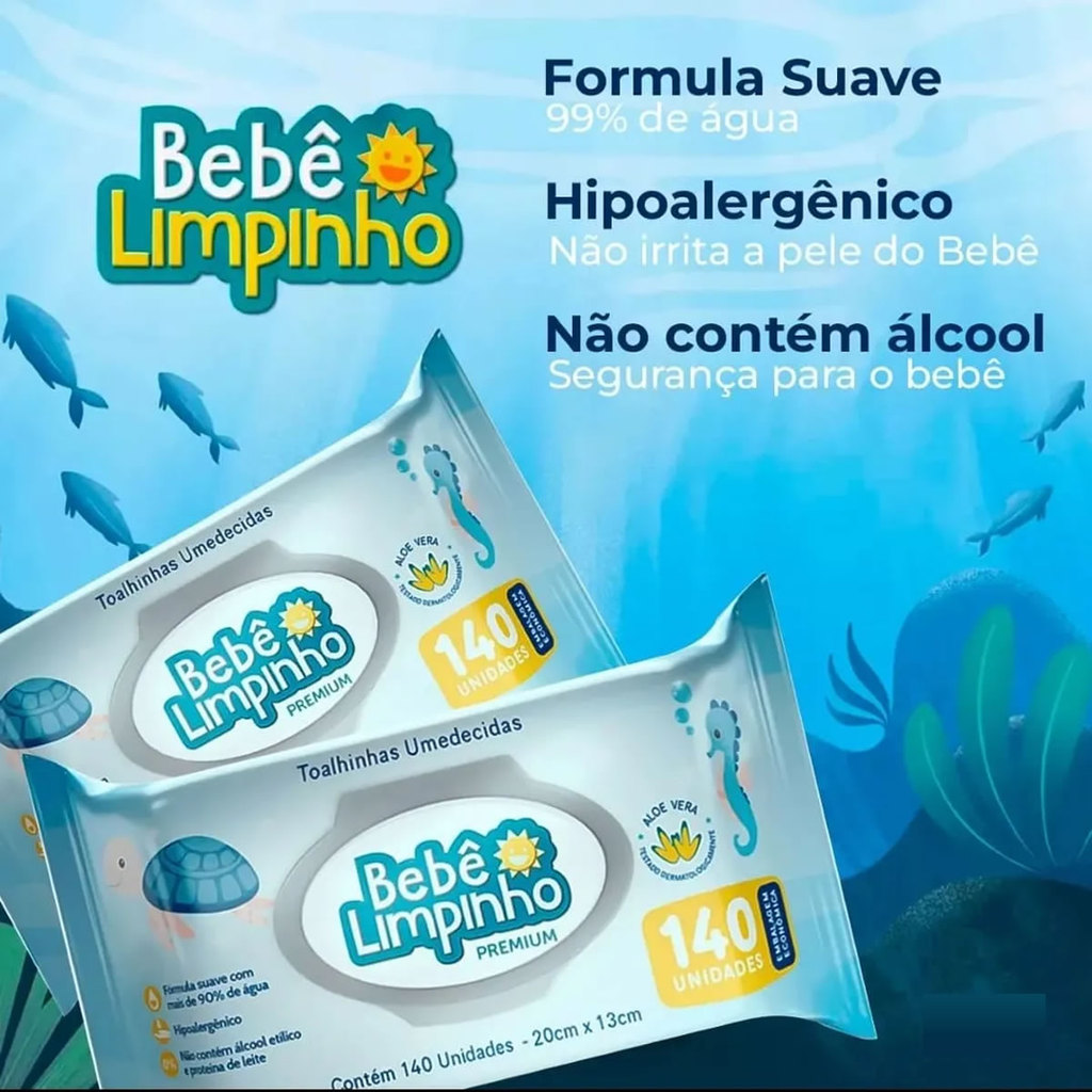 Toalha Umedecida Bebê Limpinho Premium 140 Unidades A Toalha Umedecida Bebê Limpinho foi especialmente desenvolvida para limpeza do seu bebê, retirado todas as impurezas de maneira delicada. Sua fórmula suave com mais de 99% de água, contém Aloe vera, que ajuda a hidrata a pele do seu bebê evitando assaduras. Além de proporcionar conforto e a praticidade necessária a cada troca de fralda, tornando esse momento em uma troca de carinho entre você e seu bebê. Benefícios: - Testado Dermatologicamente; - Fórmula suave com mais de 99% de água; - Hipoalergênico; - Contém Aloe Vera; - Tamanho: 20x12cm; - Não Contém Álcool etílico e proteína do leite.