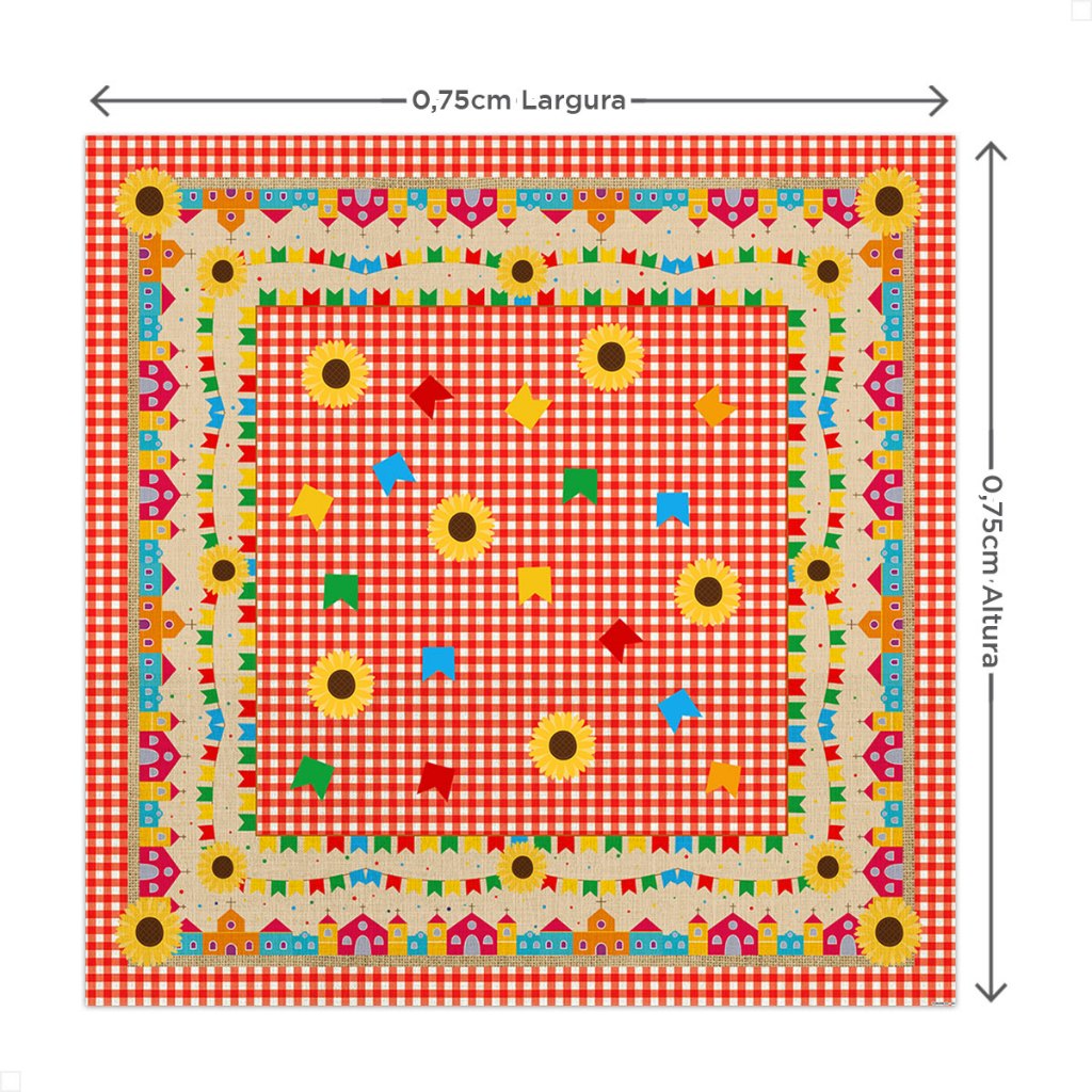 TOALHA DE MESA EM TECIDO PARA FESTA JUNINA >>> TODOS OS PRODUTOS NÃO ACOMPANHAM MESA OU OBJETOS DECORATIVOS <<< >> MEDIDA DAS TOALHAS 150x150: TAMANHO ÚNICO COM ACABAMENTO A LASER 1,50m de largura por 1,50m de altura >> DICAS DE USO: Perfeitas para utilização em mesas com a medida de 0,70x0,70cm, como as mesas de bar de plástico ou de metal. >> MEDIDA DAS TOALHAS 075x075: TAMANHO ÚNICO COM ACABAMENTO A LASER 0,75cm de largura por 0,75cm de altura >> INCLUSO: 4 Toalhas de mesa em tecido soft >> DICAS DE USO: Perfeitas para utilização em mesas com a medida de 0,70x0,70cm, como as mesas de bar de plástico ou de metal. >> FICHA TÉCNICA: Tecido Malha Soft Tecido leve com ótimo caimento Gramatura: 110g/m de excelente qualidade Composição do Tecido: 95% Poliéster e 5% de Elastano >> MEDIDA DO CAMINHO: TAMANHO ÚNICO: 0,40m de largura por 1,40m de altura. >> DICAS DE USO: Perfeitos para mesas, balcões e aparadores, adicionando um toque especial de charme à sua decoração de Festa Junina. >> FICHA TÉCNICA: Tecido Oxford Tecido grosso e com alta durabilidade Gramatura: 140 g/m de excelente qualidade Composição do Tecido: 100% Poliéster >> BENEFÍCIOS: • Fácil utilização • Não desbota, pode ser lavado quantas vezes desejar • Secagem rápida • Alta durabilidade • Acabamento à laser evitando que o tecido desfie >>>>>>>>>>>>>>>>>>>>>>>>>>>>>>>>>>> DÚVIDAS FREQUENTES: ACOMPANHA MESA E ELEMENTOS DECORATIVOS? Não acompanha mesa e elementos decorativos, vendemos somente a toalha em tecido. TRABALHAM COM PERSONALIZAÇÃO? Não! Nós optamos para uma melhor eficiência no processo de postagem do pedido, com isso trabalhamos com produtos prontos. QUANDO É FEITO O ENVIO? Trabalhamos com produtos à pronta entrega, comprando e sendo aprovado o pagamento no dia (PIX, CARTÃO DE CRÉDITO ou DÉBITO) o envio é feito em até 2 dias úteis, podendo ser enviado antes. POSSUI GARANTIA? Nosso produto possui garantia contra defeito de fabricação. PRODUTO COM NOTA FISCAL? Todos os produtos acompanham nota fiscal. >>> Tem alguma dúvida antes de finalizar sua compra? Envie uma mensagem para nós que ajudaremos você! <<<