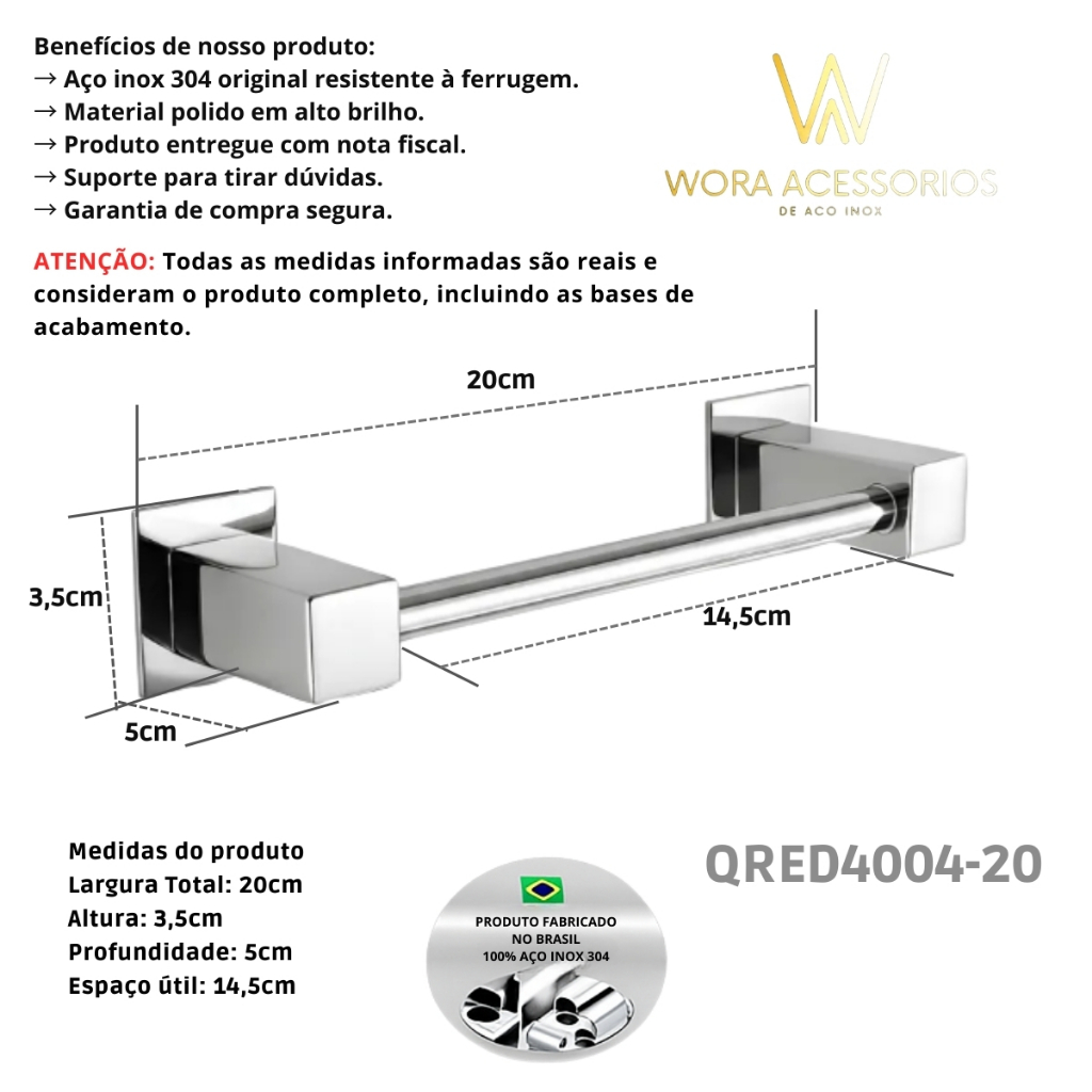 Toalheiro Porta Toalha De Rosto 20cm Inox 304 - QRED4004-20 - Material: 100% Aço inoxidável 304 - Kit para montagem com parafusos de aço inox. - Cor: Inox 304 Polido. - Acabamento: Aço inox polido em alto brilho e fino acabamento. - Utilização: Banheiros, lavabos e outros. - Garantia: 10 anos contra defeitos de fabricação. - Produto novo com manual de instalação e nota fiscal de venda. - Empresa fabricante Brasileira. INFORMAÇÃO DO PRODUTO: Transforme seu banheiro com nosso toalheiro de rosto de 20cm em Aço Inox! Você está em busca de praticidade e elegância para o seu banheiro? Apresentamos o Toalheiro de Rosto em Aço Inox, a solução perfeita para quem valoriza qualidade e estilo. Durabilidade é uma das principais características do aço inox, que garante um produto resistente à corrosão e fácil de limpar. Diga adeus à ferrugem e ao desgaste! O nosso toalheiro mantém-se sempre brilhante e como novo, mesmo após anos de uso. Além disso, a sua instalação é simples e rápida, permitindo que você aproveite seu novo acessório em poucos minutos. O design moderno e minimalista se adapta a qualquer estilo de decoração, trazendo sofisticação para o seu espaço. Imagine ter um toalheiro que não apenas organiza suas toalhas, mas também acrescenta um toque de classe ao seu banheiro! Compre agora e descubra a diferença que um Toalheiro de Rosto em Aço Inox pode fazer. Aproveite nossa promoção especial e garanta já o seu! Qualidade, estilo e praticidade estão a um clique de distância. Não perca essa oportunidade! Medidas Altura: 3,5cm Largura: 20cm Profundidade: 5cm Área útil: 14,5cm Veja todos os produtos Wora Acessórios de Aço Inox, basta clicar em mais produtos do vendedor. Desde já agradecemos!!
