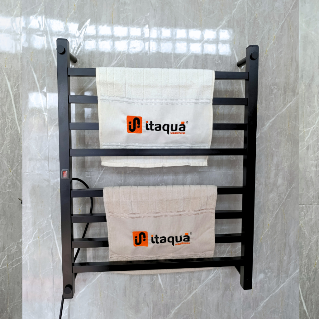 Toalheiro Térmico Versátil, basta vira-lo ao lado desejado para o alcance de sua tomada. Dimensões do Produto: Altura: 69cm X Largura: 52cm X Profundidade:11cm Favor selecionar a variação de cor e tensão desejada. ATENÇÃO: Produto NÃO bivolt. Com o toalheiro elétrico da Itaquá Resistências é possível ter sua toalha sequinha, aquecida nos dias frios e úmidos, estendendo assim o ciclo de lavagem de suas toalhas, evitando proliferação de bactérias, ácaros e fungos. Tudo isso com um produto de baixo gasto de energia, Garanta já a praticidade de ter toalhas secas em poucas horas e decrete o fim de varais cheios de toalhas por dias. Totalmente feito de alumínio, nas cores Preto e Branco para escolher qual combina mais na decoração de seu banheiro, confeccionado para ambientes úmidos, garantindo a segurança de quem o usar.