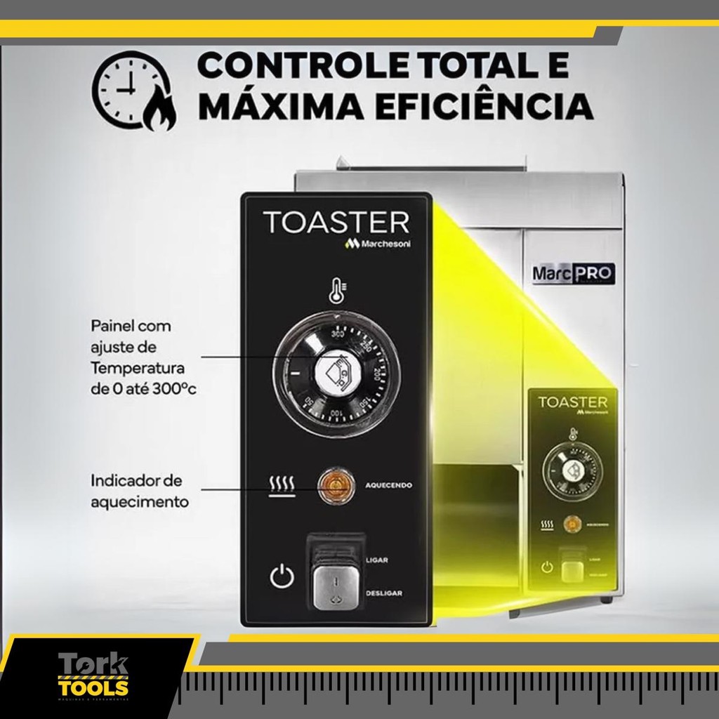 Toaster Marcpro Tostadeira de Pão Vertical 2000W Marchesoni – Alta Produtividade e Padrão de Qualidade para Sua Cozinha O Toaster Vertical MarcPro é a escolha perfeita para cozinhas profissionais que exigem agilidade, padronização e alto desempenho. Ideal para hamburguerias, lanchonetes e cozinhas comerciais, esse equipamento é capaz de tostar mais de 1.000 pães por hora, mantendo o sabor e a textura crocante por muito mais tempo. Com tecnologia avançada, seis configurações de altura do pão, painel intuitivo e controle de temperatura de até 300°C, o toaster proporciona rapidez, praticidade e qualidade consistente em cada preparo. Benefícios: * Alta produtividade: Tosta até 6 pães a cada 9 segundos. * Padrão e sabor consistentes: Altura ajustável e selagem sem manteiga. * Mais organização: Libera espaço na chapa e reduz contaminações cruzadas de sabor. * Redução de desperdício: Controle preciso de temperatura evita pães queimados. * Pré-aquecimento Rápido: o toaster atinge a temperatura ideal em 30 minutos e mantém essa temperatura para garantir desempenho uniforme durante toda a operação * Ciclo contínuo: Esteira de silicone automatizada transporta os pães sem paradas. Características principais: * Design robusto e profissional: Estrutura em aço e acabamento de alta durabilidade. * 6 configurações de espessura: Compatível com diversos tamanhos de pães. * Toque de eficiência: Painel com controle de temperatura de 0°C a 300°C. * Selagem sem manteiga: Protege o pão sem alterar o sabor. * Menos sujeira: Sem farelos na chapa, facilitando a limpeza da cozinha. Informações Técnicas: - Tensão: 220V - Potência: 2.000 W - Dimensões (AxCxL): 60 x 35 x 45 cm - Peso Líquido: 23 kg - Peso Bruto: 24 kg - Capacidade de produção: + de 1.000 pães por hora - Controle de temperatura: 0°C a 300°C - Painel: Intuitivo, com luz indicativa de aquecimento Ideal para: - Hamburguerias - Lanchonetes - Restaurantes - Food trucks - Cozinhas industriais Ganhe tempo, padronize seu processo e sirva pães perfeitamente tostados com o Toaster Vertical MarcPro! Marca: Marchesoni Modelo: TR.1.102