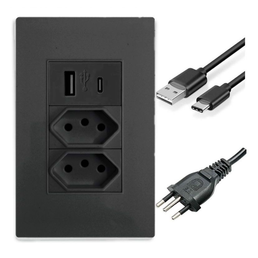 Tomada de Parede Dupla Com Entrada Usb e tipo C Preta 5V Bivolt - 4 em 1 Carregamento Rápido Multi Carregamento