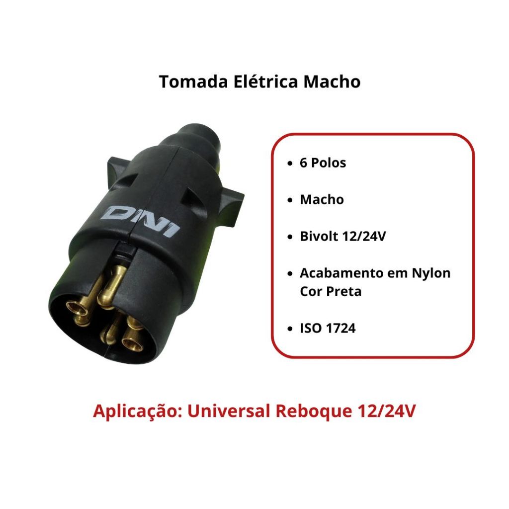 Tomada Elétrica Carretinha Caminhão Reboque Conector Macho 6 Polos Bivolt 12v/24v Nylon DNI 8380