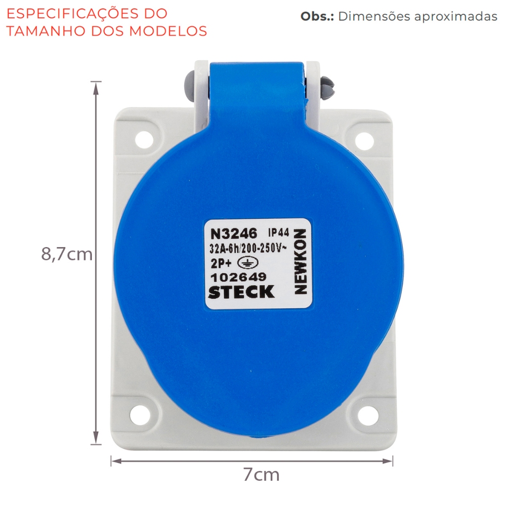 Tomada Femea Embutir Newkon 32A 220/240V 2P+T 3 Pinos 6H Azul Industrial P/ Paineis Elétricos Steck