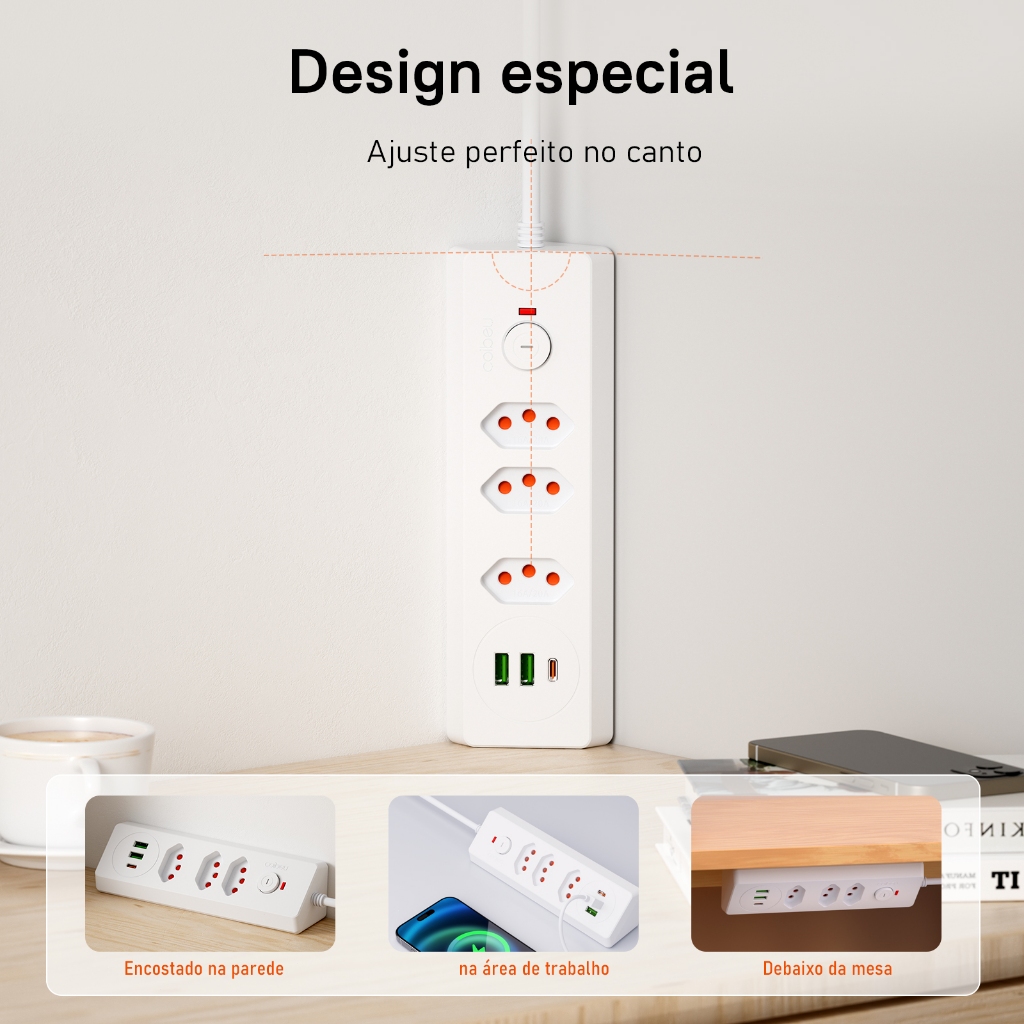 🔌 Design Versátil • 3 tomadas de energia + 2 portas USB-A + 1 porta Type-C: carregue vários dispositivos ao mesmo tempo 📱 • Design especial que se ajusta perfeitamente em cantos, encostado na parede, na área de trabalho ou debaixo da mesa 🏠 🛡️ Proteção Avançada • Proteção contra sobrecarga: desligamento automático para proteger seus aparelhos elétricos 🔒 • Proteção múltipla: contra corrente excessiva, curto-circuito e sobrecarga ⚡ • Material retardante de chamas: PC+ABS, maior segurança contra incêndios 🔥 • Travas de segurança para crianças: portas com proteção para prevenir choques elétricos 👶 🔋 Especificações de Carregamento • Saída USB: 5V / 2.1A (máx), carregamento rápido e eficiente 🚀 • Tensão nominal: AC100-240V 50/60Hz, compatível com diversos padrões 🌍 • Potência máxima: 4000W, suporta equipamentos de alta potência 💪 📏 Construção Robusta • Cabo 33% mais grosso: menor resistência para melhor condução elétrica e segurança 🔌 • Comprimento do cabo: 180cm, alcance extra para suas conexões 📏 • Corrente: 16/20A, ideal para uso residencial e comercial 🏢 📐 Dimensões e Peso • Tamanho: 19,7cm x 5cm x 5cm 📦 • Peso: 326g, compacto e portátil 🪶 • Material: PC+ABS, durável e resistente 🛠️ • Cores disponíveis: Branco, Preto ⚪⚫ 🎯 Ideal para Escritórios, residências e ambientes comerciais, oferecendo segurança, versatilidade e praticidade no dia a dia ✅