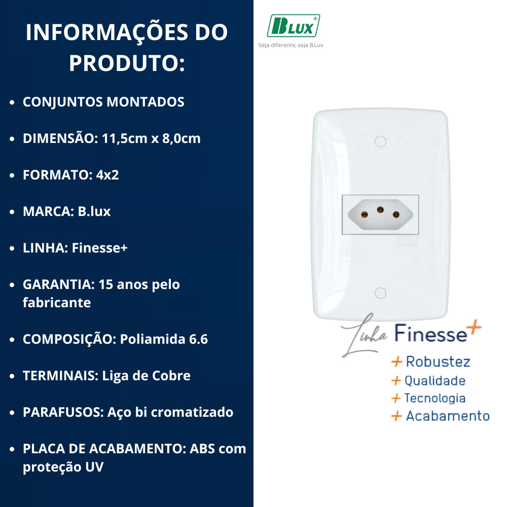 Somos a M.A TEIXEIRA LTDA sejam muito bem vindos! Aqui nós realizamos seu envio o mais rápido possível, com toda dedicação, segurança e satisfação em atendê-los CRIAMOS SEU KIT CONFORME SUA NECESSIDADE, BASTA SOLICITAR NO CHAT! -REVENDEDOR AUTORIZADO BLUX. -PRODUTOS ORIGINAIS. -PRODUTOS ENVIADOS COM NOTA FISCAL. -ENVIO EM ATÉ 24H UTEIS Apresentamos a linha de tomadas FINESSE+ de design moderno, destacando-se pelos cantos arredondados que conferem um visual elegante. Fabricadas com materiais de alta qualidade, estas tomadas não apenas oferecem um acabamento sofisticado que complementa qualquer ambiente, mas também garantem durabilidade e funcionalidade. Sistema semi modular, compatível apenas com os módulos da linha FINESSE+ LINHA FINESSE+ B.LUX +Robustez +Qualidade +Tecnologia +Acabamento Proteção UV * SELO DO INMETRO * NÃO RETÉM POEIRA * ENCAIXE DOS MÓDULOS PERFEITO * ACABAMENTO DA PLACA CANTOS LEVEMENTE ARREDONDADOS * LIMPEZA FÁCIL * UNICOS MÓDULOS COM 4 ENTRADAS PARA FIOS E CABOS INDEPENDENTES EM CADA BORNE ** Perguntas frequentes sobre o produto ** • Acompanha suporte ? Sim, os suportes são enviados fixados junto com as placas. • Posso usar em 127v ou 220v? Sim, a tensão máxima suportada é 250v. • O que é 10A e 20A? 10A significa 10 Ampères, ou seja, a corrente máxima que a tomada suporta. Vale lembra que as tomadas 10A tem seu plug mais fino e a de 20A seu plug mais grosso. Isso para suportar os equipamentos de maior potência. • Montam um anuncio com os itens que preciso? Sim, montamos kits com os itens que desejar. Ficou com duvidas? Nos chame no campo de perguntas, estamos sempre à disposição para melhor atendê-lo.