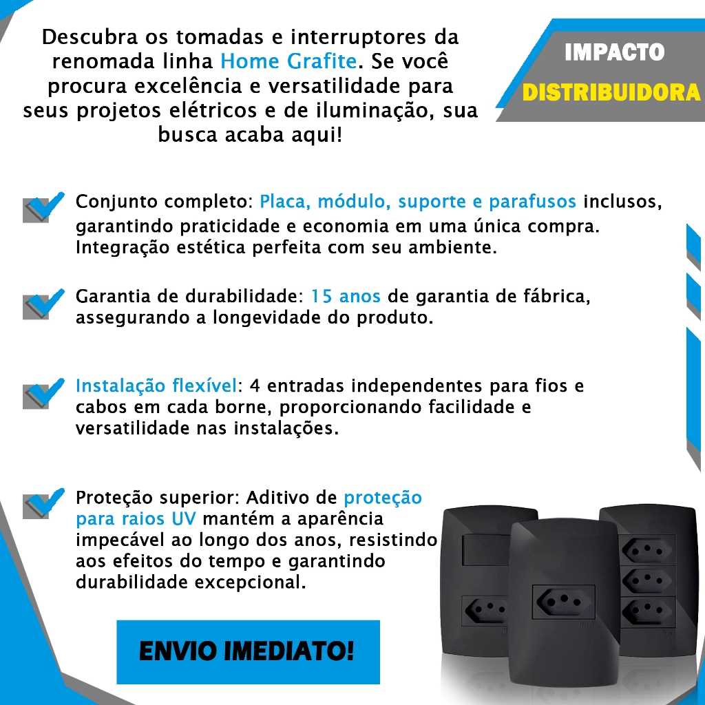 BEM VINDO A IMPACTO DISTRIBUIDORA MONTAMOS SEU KIT PERSONALIZADO BASTA NOS ENVIAR SEU ORÇAMENTO PELO CHAT DE PERGUNTAS ======================================================= - Fixação de condutores com exclusivo borne gaiola com parafusos imperdíveis. - Posso montar diferentes modelos Sim, você tem a opção de substituir os módulos das tomadas, fazendo diversas variações, SEJA DIFERENTE, SEJA B-LUX. Garantia: 15 ANOS DO FABRICANTE Para efetuar a compra de mais de uma peça: Selecione todos os itens que você precisa e é só ir adicionando no carrinho ou nos contate no chat que criamos um link exclusivo para você