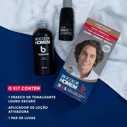 A nova linha de Tonalizantes Biocolor Homem Bozzano volta com aplicação completa para barba, cabelo e bigode! Com textura cremosa, promove um resultado de cobertura intensa para os seus cabelos. O novo Tonalizante Louro Escuro 3x1 tonaliza, hidrata e fortalece os fios. Sua fórmula é enriquecida com biopolímeros e é livre de amônia, contendo ingredientes que hidratam os fios enquanto tonalizam, sem avermelhar. Conta com uma ação rápida, que age em apenas 5 minutos, durando até 30 lavagens. É indicado para todos os tipos de cabelo. Esse kit contém 1 tonalizante, 1 loção ativadora e 1 par de luvas.