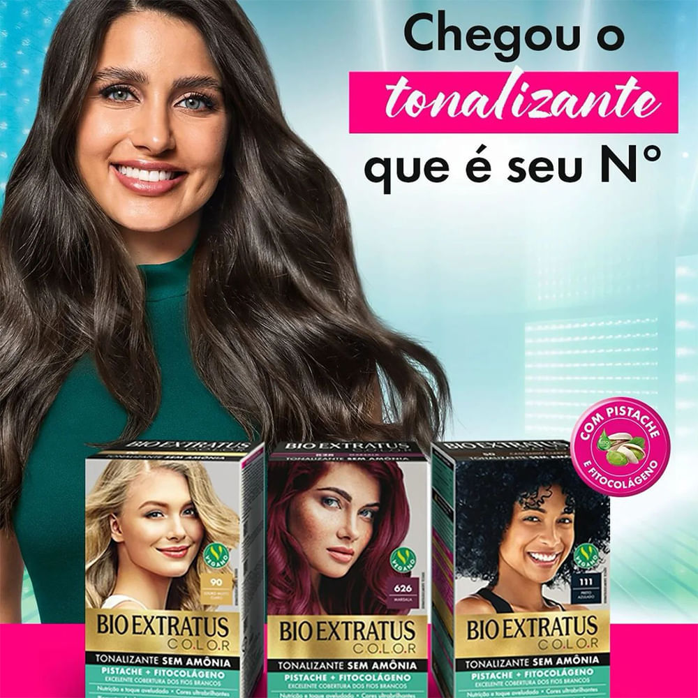 O Tonalizante Sem amônia Bio Extratus Color 135g combina tecnologia de ponta e cuidado delicado para transformar seus cabelos com cores intensas e brilho extraordinário. Sua fórmula profissional é vegana, livre de amônia e metais pesados, garantindo uma coloração segura que respeita a saúde dos fios. Enriquecido com pistache e fitocolágeno , promove uma nutrição profunda enquanto fortalece e repara a fibra capilar. O resultado são cabelos hidratados, com uma tonalidade deslumbrante, maciez incomparável e um toque sedoso que realça sua beleza natural. Diferenciais e Benefícios: - Coloração Suave: Ideal para quem busca mudança sem danificar os fios. - Nutrição e Proteção: Ativos naturais que restauram e fortalecem a estrutura capilar. - Brilho Intenso: Núcleos vibrantes e luminosos que duram por muito mais tempo. - Toque Aveludado: Fios macios e sedosos, com aspecto saudável. - Sustentabilidade: Fórmula vegana, respeitando você e o meio ambiente. Modo de usar: Misture o Creme Tonalizante sem amônia com a Emulsão Reveladora, seguindo as instruções contidas na bula do Kit. Prova de toque / sensibilidade: prepare um pouco do produto e aplique uma pequena quantidade no antebraço ou atrás da orelha. Deixe agir por 30 minutos e enxágue. Se dentro de 48 horas após a realização do teste surgir irritação no local ou em suas proximidades, tais como rubor, inchaço, ardência ou queimadura, fica provada a hipersensibilidade ao produto, não devendo ser utilizado. Sobre a marca: A história da Bio Extratus começou em Belo Horizonte, em 1989, em um salão-escola onde os cabeleireiros Vera e Lindouro, apaixonados pela natureza, vieram a idealizar uma marca que unisse qualidade, acessibilidade e cuidado. Motivados pela busca por cosméticos diferenciados, eles têm origem na Bio Extratus, uma empresa focada em oferecer tratamentos ideais para todos os tipos de beleza. Desde então, uma marca se consolidou no mercado como referência em produtos de alta performance, modificados com ingredientes naturais e voltados para valorizar a diversidade e a saúde dos cabelos.