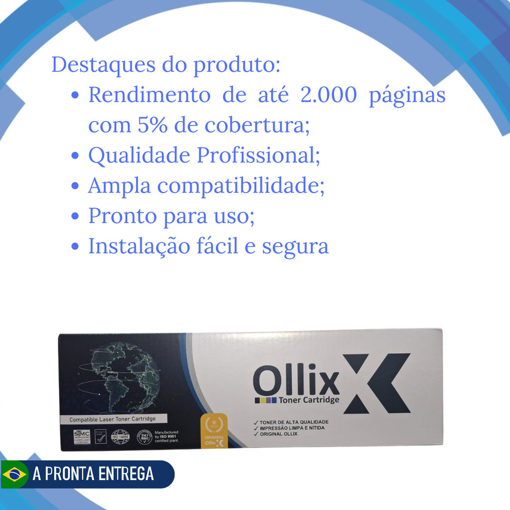 Seja bem-vindo(a) à sua Loja! Produto: Toner Compatível Ollix H-CB35A / H-CB36A / H-CE285A / H-CE278A – Alto Rendimento e Qualidade Profissional QUALIDADE DE IMPRESSÃO, ECONOMIA E DESEMPENHO PARA O SEU DIA A DIA! Destaques do Produto: •Alto rendimento: Até 2.000 páginas com 5% de cobertura, ideal para uso residencial, escritórios e empresas. •Qualidade Profissional: Impressões nítidas, com excelente definição de texto e gráficos, sem falhas ou borrões. •Compatibilidade ampla: Substitui os modelos HP CB435A, CB436A, CE285A e CE278A, utilizado em diversas impressoras LaserJet. •Pronto para uso: Produto novo, lacrado, com chip incluso para instalação imediata. •Instalação fácil e segura: Projetado para encaixe perfeito e funcionamento sem complicações. •Economia Garantida: Excelente custo-benefício com desempenho comparável ao toner original. Compatível com os modelos de impressoras HP: •HP LaserJet P1005, P1006 (CB435A) •HP LaserJet P1505, M1120, M1522 (CB436A) •HP LaserJet P1102, M1132, M1212, M1214, M1217 (CE285A) •HP LaserJet P1566, P1606dn, M1536dnf (CE278A) Especificações Técnicas: •Modelo: Toner H-CB35A/36A/85A/78A Compatível •Marca: Ollix •Rendimento: Aproximadamente 2.000 páginas com 5% de cobertura •Cor: Preto •Tipo: Compatível com chip •Estado: Novo, lacrado Conteúdo da Embalagem: 01 x Toner compatível Ollix para HP H-CB35A / H-CB36A / H-CE285A / H-CE278A Observações: Produto compatível, não original Fotos ilustrativas Verifique a compatibilidade com seu equipamento antes da compra __________________________________________________ COMPRA GARANTIDA PELA PLATAFORMA MARKETING PLACE __________________________________________________ Envio rápido com segurança e suporte ao cliente. Palavras-chave: toner hp 85a compatível, toner 36a ollix, toner 78a laserjet, toner 35a impressão, toner hp p1102, toner hp m1132, toner hp p1005, toner econômico, toner preto para impressora hp, toner compatível ollix.