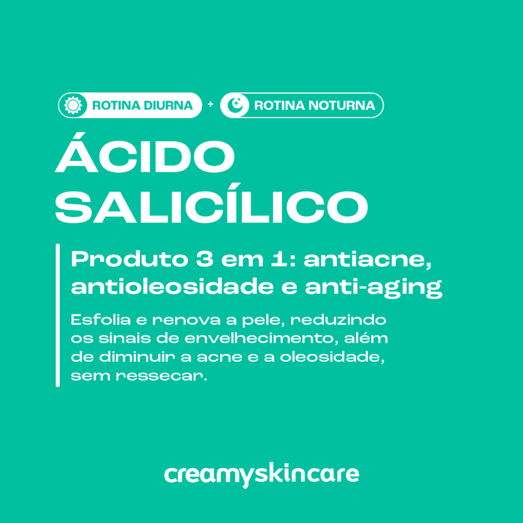 O que é? A solução tônica antiacne da Creamy traz o ácido salicílico a 2% numa textura líquida para ser usada logo após a limpeza da pele. Pode ser aplicada sozinha ou em combinação com outros tratamentos. Esse tônico reduz imediatamente a oleosidade, desobstruindo os poros e fazendo uma esfoliação química superficial, que evita a formação de cravos e espinhas. Traz um complexo que equilibra a microbiota da pele, impedindo a proliferação de bactérias nocivas, como a bactéria causadora da acne. Traz ainda ingredientes suavizantes e calmantes que tornam essa solução segura para as peles mais sensíveis, regulando a oleosidade sem ressecar.