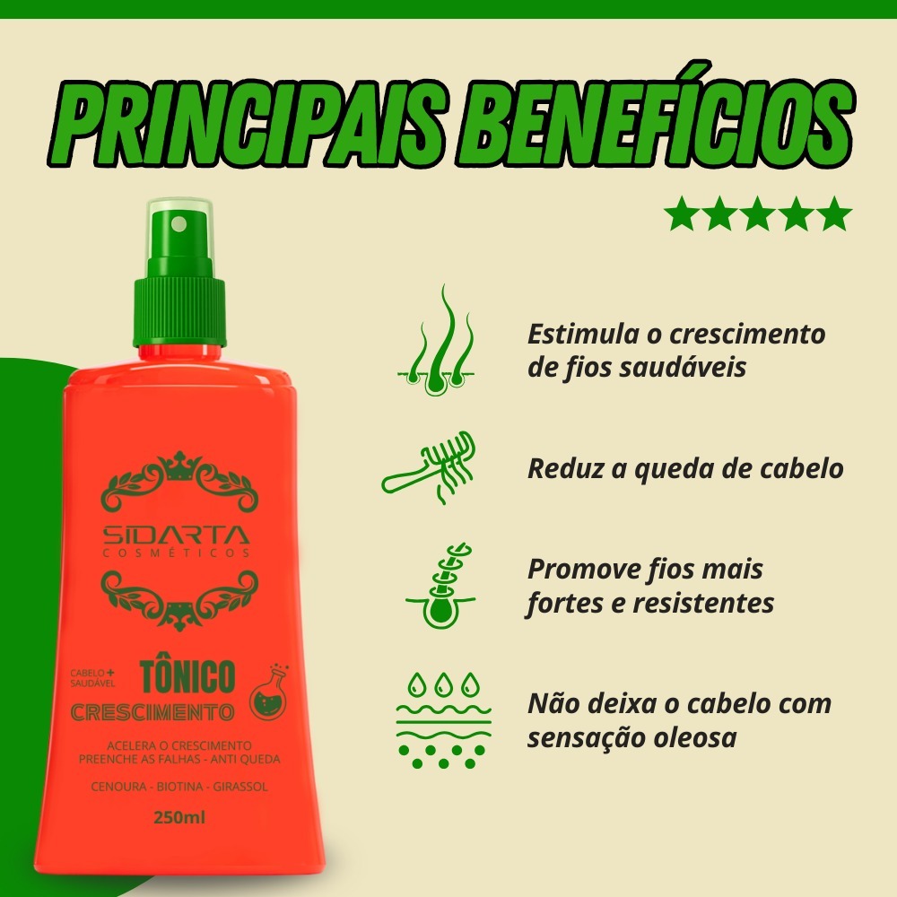 🔥 TÔNICO CAPILAR SIDARTA – Crescimento Acelerado e Fios Fortalecidos! 🔥 O Tônico Capilar Sidarta é um tratamento intensivo para quem deseja cabelos mais fortes, volumosos e saudáveis. Sua fórmula avançada combina ingredientes naturais e altamente eficazes para fortalecer os fios, reduzir a queda e estimular o crescimento desde a raiz, para todos os tipos de cabelos, seja você homem ou mulher que queira cuidar de seus cabelos este é o produto ideal. 🌿 Composição Poderosa para Resultados Reais: Nosso tônico é enriquecido com ativos naturais que atuam diretamente no couro cabeludo, proporcionando nutrição profunda e estimulando o crescimento capilar. ✔ Biotina – Reduz a quebra e fortalece a fibra capilar. ✔ Ginseng Brasileiro – Melhora a circulação sanguínea, garantindo mais oxigenação e absorção de nutrientes. ✔ Extrato de Pimenta (Capsicum Annuum) – Ativa a microcirculação, acelerando o crescimento dos fios. ✔ Extrato de Urtiga – Controla a oleosidade e reduz a queda. ✔ Extrato de Cenoura – Rico em vitaminas A e E, nutre e revitaliza os fios desde a raiz. ✔ Chinchoa Calisaya – Fortalece e melhora a resistência dos fios. ✔ Arnica Montana – Auxilia no fortalecimento e combate à queda capilar. ✔ Triticum Vulgare (Extrato de Gérmen de Trigo) – Hidrata e fortalece os fios. ✔ Menthol – Proporciona sensação refrescante e ativa a circulação sanguínea no couro cabeludo. 💆♀ Como Usar? 🔸 Aplique diretamente no couro cabeludo após lavar os cabelos, com os fios úmidos ou secos. 🔸 Massageie suavemente para ativar a circulação. 🔸 Não enxágue – deixe os ativos agirem ao longo do dia. 🔸 Use diariamente ou em dias alternados para melhores resultados. 🌟 Transforme seus cabelos em 90 dias! Garanta já o Tônico Capilar Sidarta e conquiste fios mais fortes, volumosos e saudáveis! 💛✨