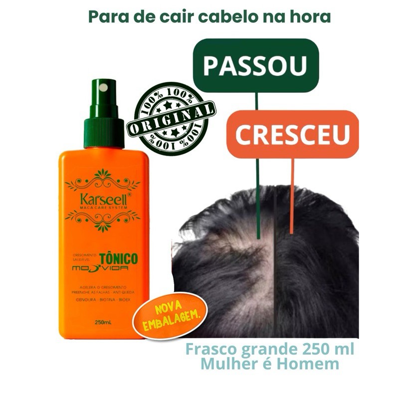 🔥 TÔNICO CAPILAR PODEROSO KARSEELL – CRESCIMENTO E FORTALECIMENTO DOS FIOS! 🔥 Chegou o Tônico Capilar Karseell Original, a solução perfeita para quem deseja cabelos mais longos, fortes e saudáveis! 💆♀️✨ ✅ Acelera o crescimento capilar ✅ Fortalece os fios da raiz às pontas ✅ Reduz a queda e combate a quebra ✅ Nutrição profunda para cabelos mais volumosos e brilhantes 💥 Fórmula poderosa e comprovada, feita para quem quer resultados reais! Não perca tempo, garanta já o seu Tônico Capilar Karseell Original e conquiste o cabelo dos seus sonhos! ✅ COMO USAR: 1️⃣ Com os cabelos secos ou úmidos, aplique diretamente no couro cabeludo. 2️⃣ Massageie suavemente com as pontas dos dedos para ativar a circulação. 3️⃣ Não enxágue! Use diariamente para resultados mais rápidos e visíveis. 🚀 PARE DE SOFRER COM CABELOS FRACOS E SEM VIDA! O Tônico Karseell Original é o queridinho de quem busca um crescimento rápido e eficaz. • Extrato de Cenoura: Rico em vitaminas e antioxidantes, este extrato ajuda a repor a hidratação dos fios, proporciona brilho, realiza uma limpeza suave no couro cabeludo, remove impurezas e estimula o crescimento saudável dos cabelos.  • Biotina (Vitamina B7): Conhecida por estimular o crescimento capilar, prevenir o aparecimento de fios brancos, recompor a espessura dos fios, fortalecer e rejuvenescer o cabelo.  • Bioex Capilar: Um complexo de extratos vegetais e princípios ativos tradicionalmente utilizados na prevenção e combate à queda de cabelo. Este complexo reúne os princípios ativos dos seguintes extratos: quina, capsicum, pólen, arnica, urtiga, pfaffia, gema de ovo, germe de trigo e acetil metionina.  Além desses componentes, algumas formulações do tônico Karseell podem incluir outros ingredientes benéficos, como: • Menta: Conhecida por suas propriedades refrescantes, a menta estimula a circulação sanguínea no couro cabeludo, favorecendo o aporte de nutrientes essenciais para os folículos capilares.  • Aloe Vera: Reconhecida por suas propriedades hidratantes e regeneradoras, a aloe vera atua profundamente nos fios, promovendo elasticidade e reduzindo a quebra.  • Alecrim: Este ingrediente possui propriedades antioxidantes que ajudam a fortalecer a raiz dos fios e estimular o crescimento capilar