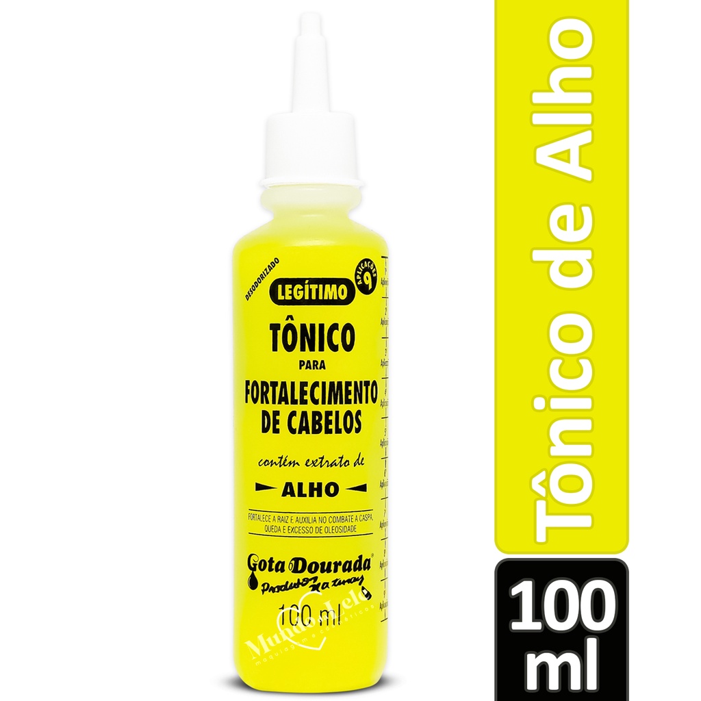 Legítimo Tônico para Fortalecimento De Cabelos Com Extrato de Alho Gota Dourada 100ml O Tônico para fortalecimento de cabelos Gota Dourada, foi desenvolvido com Óleo de Alho, Extrato de Alho, Extrato de Aloe Vera e Calêndula, que fortalecem a raiz enfraquecida, auxiliando no Combate `a queda, caspa, e excesso de oleosidade. Desodorizado Rende 9 aplicações PROVA DE TOQUE: Aplique uma pequena quantidade do produto no antebraço ou atrás da orelha e deixe-o agir por 45 minutos. Em seguida, lave o local e aguarde 24 horas. Caso apareça irritação, ardência ou coceiras na pele, o produto não deve ser utilizado. MODO DE USO: Faça a prova de toque. Aplicar 1 dose somente na raíz dos cabelos, deixe agir por no mínimo duas horas. Fazer o tratamento três vezes por semana, durante 3 meses. PRECAUÇÕES: Manter fora do alcance das crianças. Não ingerir. Em caso de contato com olhos, lavar abundantemente com água. Uso externo. COMPOSIÇÃO: Álcohol, Allium Sativum Extract, Calendula Offcinalis Extract, Aloe Barbadensis Extract, Parfum (Hexyl Cinnamal, D-Limonene, Coumarin), Cl 19140, Allium Sativum, Aqua (water).