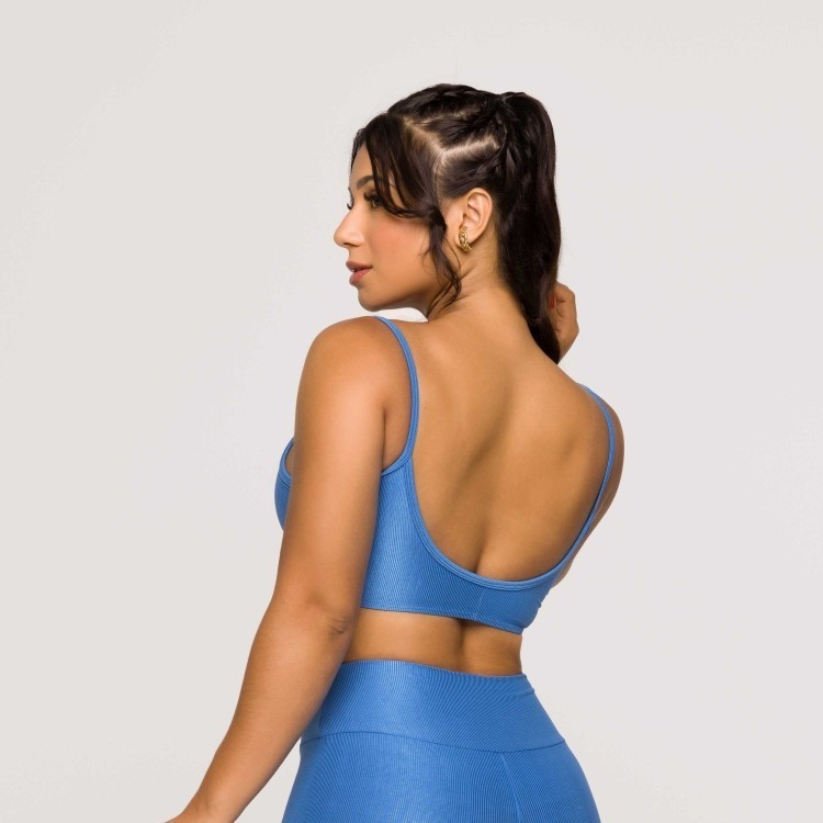 Top Academia Fitness Feminino Azul Poliamida Costas Abertas