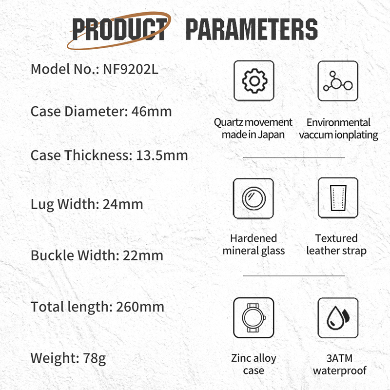 Descrição do produto Movimento de movimento de alta qualidade: Movimento Seiko: Movimento Seiko, 100% novo de alta qualidade, economia de energia e durável. À prova d'água: 30m 98FT resistente à água diária, adequado para uso diário, lavagem à mão, dias chuvosos, respingos ou imersão curta, sem problemas. Não suporta banho e natação, não opere o relógio debaixo d'água, não opere o relógio debaixo d'água, (Obs: Por favor, não opere o botão na água) Material: Vidro mineral de alta dureza (chave resistente a riscos), caixa de liga de aço inoxidável, caixa de aço inoxidável para trás, resistente à pressão Ideias de Presente: relógios são para Natal, Aniversário, Dia dos Pais, Dia de Graduação e Dia dos Namorados ou como presente para negócios e festas. Atendimento a: Qualquer dúvida sobre o produto, entre em contato conosco, ofereceremos o melhor atendimento!Qualquer dúvida sobre o produto, entre em contato conosco, ofereceremos o melhor atendimento! ——————————————————————————————————————— Nome da marca: NAVIFORCE Modelo do modelo: NF9202 Características do produto: Impermeável Movimento: movimento de quartzo Estilo de luxo: casual moderno, esportivo, empresa, luxo Profundidade à prova d'água 3Bar (não suporta chuveiro e natação, não opere o relógio debaixo d'água); Forma da casca do escudo redondo Características principais da principal características: - 100% novo e de alta qualidade; Mostrador de design de luxo de alta qualidade com exibição de data; Material de proteção: liga de zinco Tipo de material de janela giratória: Hardlex Material da alça de alça de alça: Couro Material da tampa inferior: aço inoxidável Tipo de fivela: Fivela Especificações do produto (aproximadamente): Diâmetro do Mostrador: - Diâmetro do Mostrador: 46 mm Largura do mostrador: 22 mm Espessura do mostrador: 13,5 mm Comprimento do mostrador: 260 mm Peso: 78 g Incluído no Pacote do pacote: Relógio NAVIFORCE 1 x Descrição (inglês)