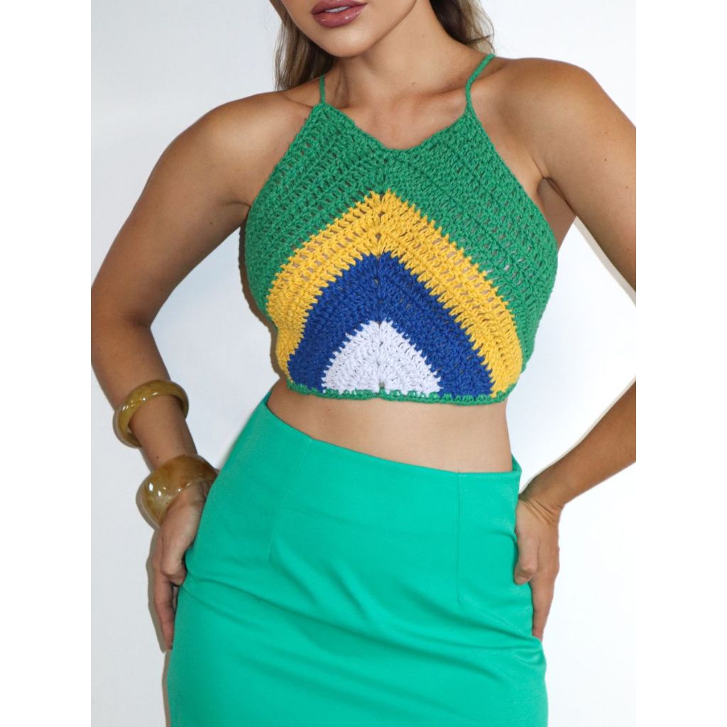 Tamanho Único: veste do 36 ao 44 - Peça possui regulagem de tamanho Produto artesanal feito à mão Descrição: Top Brasil de Crochê - 100% Algodão - Moda Praia Feminina Primavera/Verão Com muita identidade e estilo, o Top Brasil de Crochê é a escolha perfeita para quem ama moda praia com personalidade. Confeccionado artesanalmente em 100% algodão, o modelo traz as cores inspiradas no Brasil, valorizando o visual com um toque vibrante e moderno. Com modelagem cropped, alças finas e trama em crochê que garante leveza e respirabilidade, o top proporciona conforto e ótimo caimento. Ideal para compor looks de verão com saias, shorts ou calças leves, seja na praia, piscina, festivais ou passeios ao ar livre. Destaques do Produto: * Composição : 100% Algodão * Tecido macio e confortável * Cores inspiradas no Brasil * Sofisticado e Feminino * Alças finas e design moderno * Ideal para Primavera/Verão, moda praia e carnaval * Tamanho Único: veste do 36 ao 44