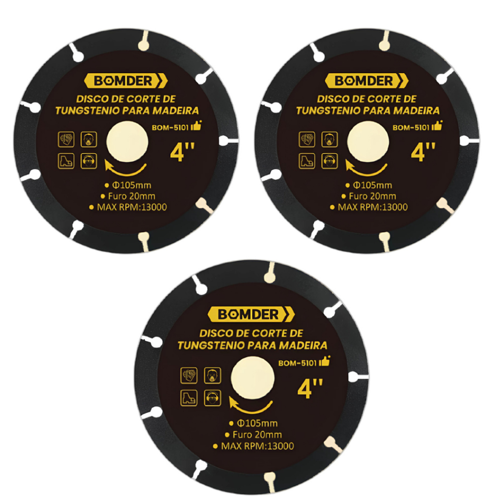 O disco de corte para madeira conta com borda revestida em carbeto de tungstecirc;nio e eacute; indicado para uso em serra maacute;rmore. Seu design projetado para um trabalho sem trancos ou vibraccedil;otilde;es, proporciona um corte suave e preciso com agilidade e total seguranccedil;a, aleacute;m de cortar materiais com resiacute;duos de grampos, pequenos pregos ou concreto. - Especificaccedil;otilde;es Teacute;cnicas: :: Composiccedil;atilde;o: Abrasivo, liga e fibra de vidro :: RPM: 13.000 :: Maacute;x.: 80m/s :: Corte a seco :: Diacirc;metro: 105mm :: Furo: 20mm