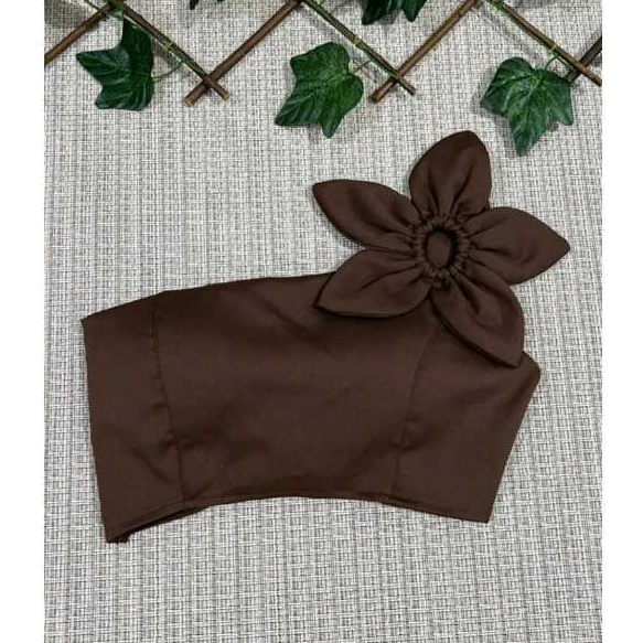 top cropped de alfaiataria de médio tomara que caia com flor elegante moda 2025