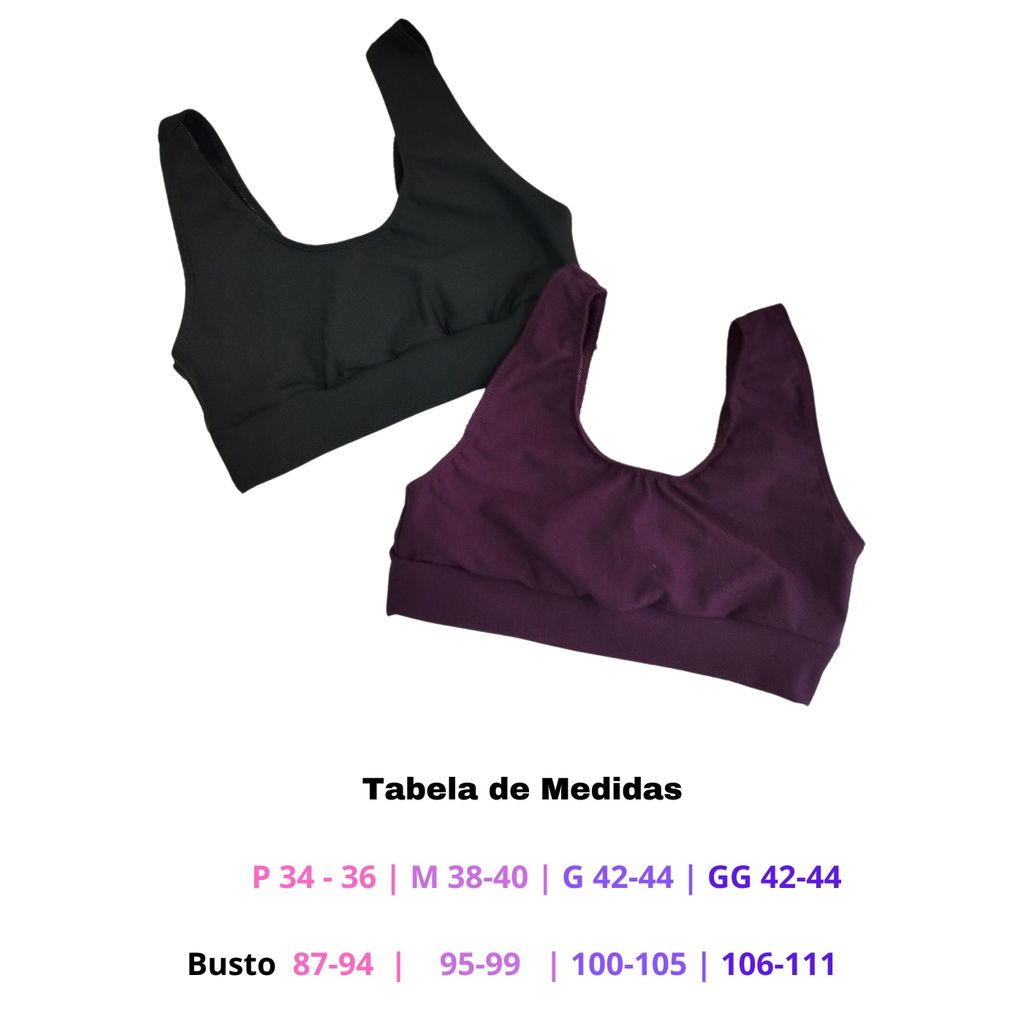 - Fabricado em Suplex - Excelente elasticidade - ótima compressão e sustentação - Costuras reforçadas - Não Fica Transparente - Não Desbota - Confortável - Não possui bojo - ———————————————————————————————— FOTOS REAIS DO PRODUTO ! ———————————————————————————————— Tabela de Medidas P 34 - 36 | M 38-40 | G 42-44 | GG 46-48 | XG 50-52 Busto (cm) 87-94 | 95-99 | 100-105 | 106-111 | 112-117 obs: Se você vestir 36 - 38, sugerimos que opte pelo tamanho M Se você vestir 40 - 42, sugerimos que opte pelo tamanho G Se você vestir 44 - 46, sugerimos que opte pelo tamanho GG Se você vestir 48 - 50, sugerimos que opte pelo tamanho XG -Tecido SUPLEX - Composição: 92% Poliéster | 8% Elastano ———————————————————————————————— ➡ ️ PERFEITO PARA ATIVIDADES FÍSICAS, GINÁSTICA, TREINO, CROSSFIT, LUTAS E ATÉ MESMO PARA O USO DIA A DIA. ———————————————————————————————— ✔ Tecido Anti Odor ✔ Secagem rápida ✔ Diversas cores para você aproveitar ✔ Tecido de alta qualidade ✔ Confortável para qualquer atividade física ✔ Não dá bolinhas ✔ Não desbota na lavagem ✔ Não encolhe ✔ Envio rápido ———————————————————————————————— ✅ | ENVIO IMEDIATO ✅ | PRODUTO EXCLUSIVO ✅ | MELHOR QUALIDADE DO MERCADO ———————————————————————————————— ➡ ️ Todos os nossos produtos passam por rigorosa inspeção de qualidade para que você receba no conforto do seu lar uma peça de excelente qualidade e acabamento. ———————————————————————————————— >>Como Escolher mais de uma Cor ou Tamanho?