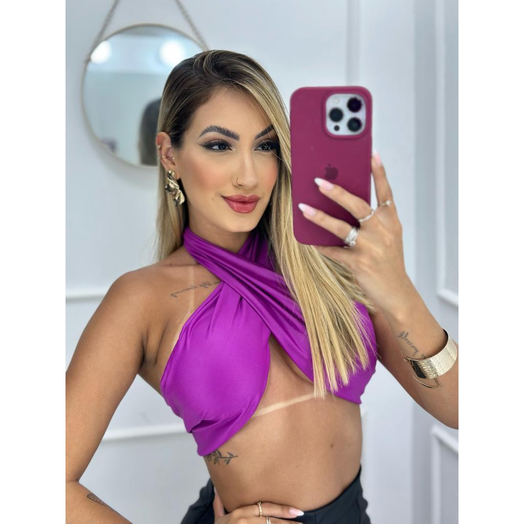 Top Cropped Transpassado com bojo Em Cirre Com Amarração no Pescoço Multiformas Moda Blogueira Verão Festas