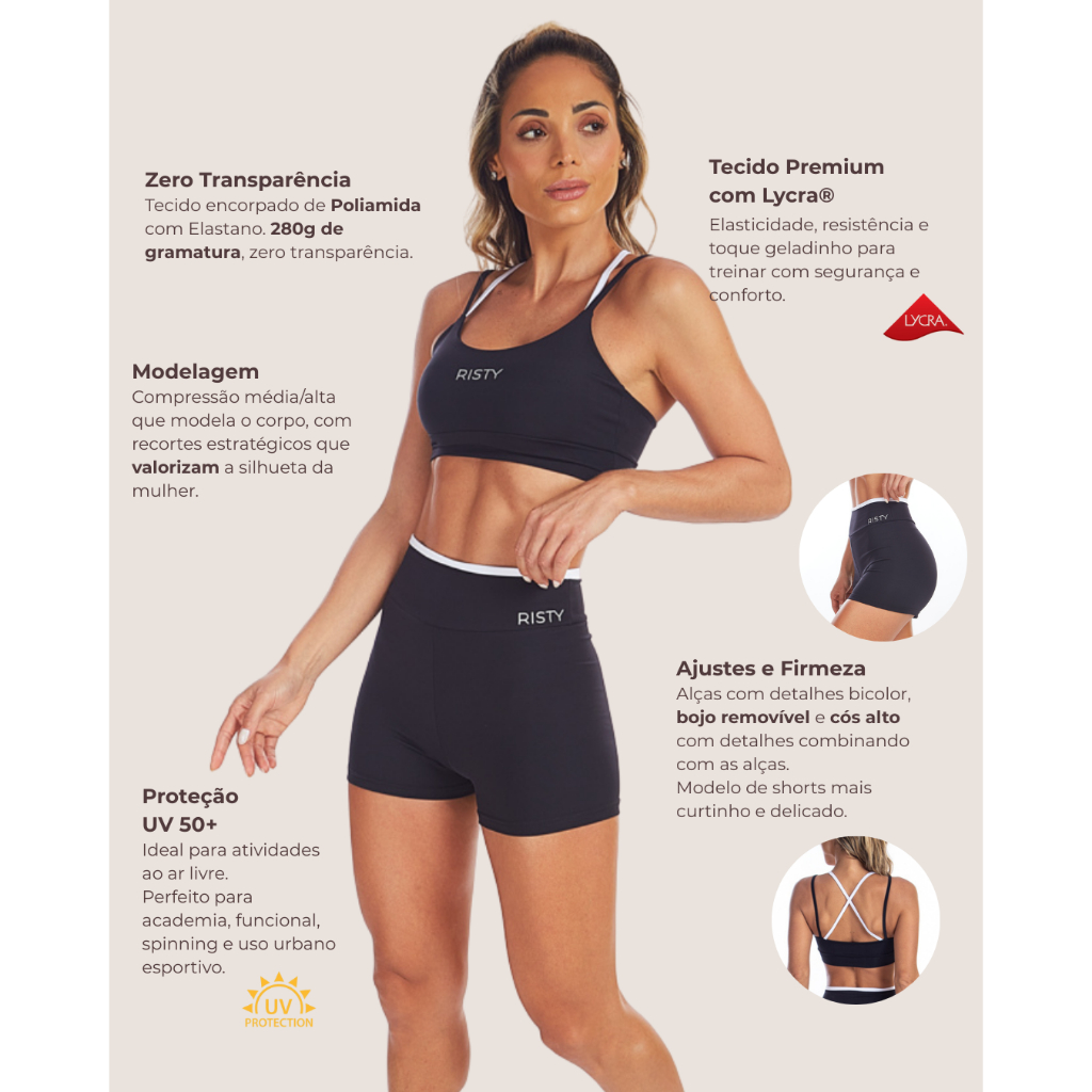 Estilo marcante e leveza em movimento. O top DUO COLOR une conforto e ousadia com um design moderno que brinca com o contraste de cores. O top com bojo removível tem alças finas e cruzadas nas costas, criando um visual delicado e firme. Um diferencial do conjunto é o logo RISTY em material refletivo, ideal para práticas ao ar livre. Indicado para: Treinos funcionais, treinos ao ar livre, corrida, academia, uso urbano esportivo e viagens. Composição: 84% Poliamida / 16% Elastano. Gramatura: 280g. Compressão: Média Tecnologia: LYCRA® + SUN PRO UV (FPU 50+). Top com bojo removível. Aplique RISTY refletivo