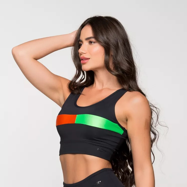 Top Fitness Academia Feminino Poliamida Preto Com Detalhe Verde e Laranja Madri Lot Fitness
