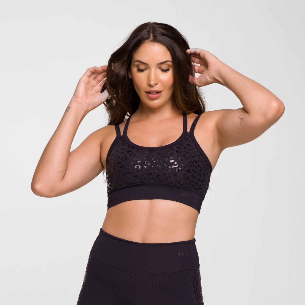 Top Fitness Feminino Academia Estampado Top Poliamida Feminino Preto para Treinar e Malhar Oncinha
