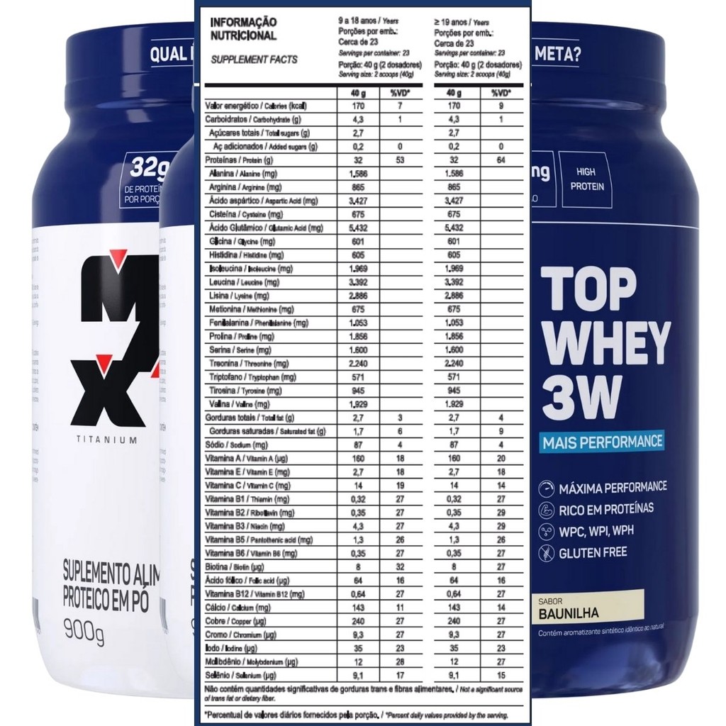 Sobre o produto: Top Whey 3W + Performance da Max Titanium é um suplemento proteico completo, ideal para quem busca ganhos de massa muscular, recuperação pós-treino eficiente e suporte nutricional diário. Sua fórmula combina três tipos de proteína do soro do leite – concentrada (WPC), isolada (WPI) e hidrolisada (WPH) –, proporcionando uma liberação gradual de aminoácidos no organismo e otimização da síntese proteica.Com um sabor suave e agradável de baunilha, o produto oferece uma excelente experiência sensorial sem abrir mão da alta qualidade nutricional. Cada dose fornece de 31g a 32g de proteínas, além de um complexo com 11 vitaminas e 6 minerais, essenciais para o metabolismo energético, imunidade e saúde geral. Como consumir - Misture 40g (2 dosadores) do produto em 150mL de água ou outra bebida de sua preferência. - Agite ou bata até completa dissolução. - Consuma de uma a duas vezes ao dia, ou conforme orientação de nutricionista ou médico. Benefícios - Fornece de 31g a 32g de proteína por dose - Combinação de whey concentrada, isolada e hidrolisada - Rica em BCAAs e aminoácidos essenciais - Enriquecida com 11 vitaminas e 6 minerais - Estimula o crescimento e manutenção da massa muscular - Favorece a recuperação após exercícios intensos - Sabor suave e cremoso de baunilha - Excelente solubilidade - Baixo teor de gordura - Sem glúten Alergênicos: Contém derivados de leite e soja.Pode conter ovo.Contém lactose. Ingredientes: Proteína concentrada do soro do leite (WPC), proteína isolada do soro do leite (WPI), proteína hidrolisada do soro do leite (WPH), mix de vitaminas e minerais [ácido ascórbico (vitamina C), nicotinamida (vitamina B3), acetato de DL-alfa-tocoferol (vitamina E), D-pantotenato de cálcio (vitamina B5), cloridrato de piridoxina (vitamina B6), riboflavina (vitamina B2), tiamina mononitrato (vitamina B1), sulfato cúprico (cobre), acetato de retinol (vitamina A), ácido fólico, iodeto de potássio (iodo), molibdato de sódio (molibdênio), picolinato de cromo (cromo), selenito de sódio (selênio), D-biotina (vitamina H), cianocobalamina (vitamina B12)], emulsificante lecitina de soja*, aromatizantes, espessante goma xantana, edulcorante sucralose. *Utilizada na fabricação da proteína do soro do leite com a função de facilitar a dissolução. Advertências - Este produto não é um medicamento. - Não exceder a recomendação diária de consumo indicada na embalagem. - Manter fora do alcance de crianças. - Produto dispensado de registro na ANVISA conforme RDC nº 27/2010. - Contraindicado para alérgicos à proteína do leite ou pessoas com intolerância à lactose. Conclusão: Top Whey 3W + Performance Baunilha é uma excelente escolha para quem busca desempenho, praticidade e sabor em um único suplemento. Sua fórmula rica em proteínas e micronutrientes favorece o ganho de massa magra, a recuperação muscular e o equilíbrio nutricional, com um sabor leve que agrada ao paladar e combina com diversas receitas ou preparos no dia a dia.