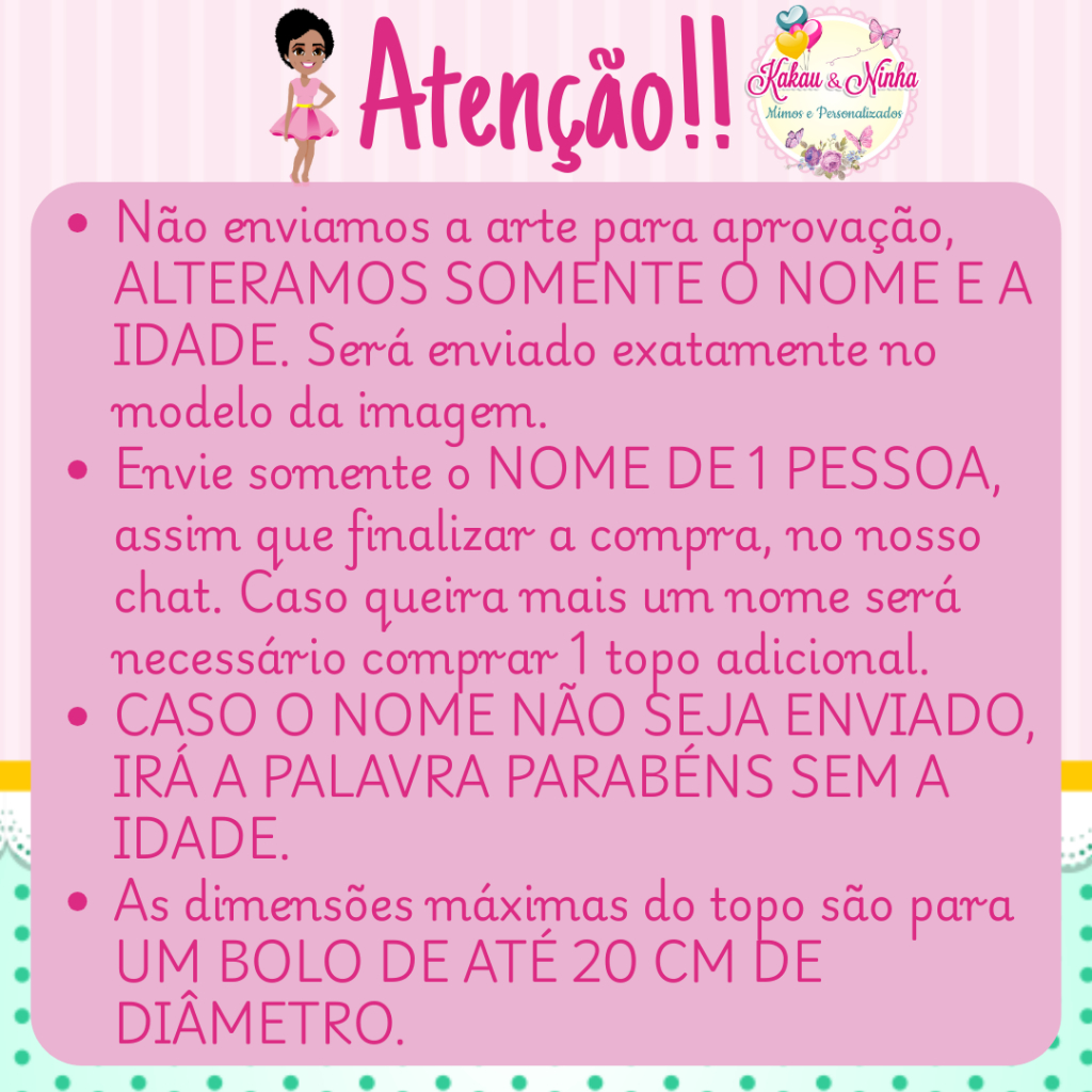 🎂✨ TOPO DE BOLO PERSONALIZADO – PRONTO PARA USAR! ✨🎂 Deixe sua festa ainda mais especial com o nosso topo de bolo personalizado, feito com materiais de alta qualidade para garantir beleza e durabilidade na sua decoração! Ideal para bolos de até 20cm de diâmetro. 📌 DETALHES DO PRODUTO: ✔️ Palitos em acrílico resistentes ✔️ Canudo acrílico incluso (se aplicável ao modelo) ✔️ Produto enviado pronto para aplicar no bolo ✔️ Personalização com nome e idade (conforme modelo da imagem) ✔️ Flores feitas manualmente ⚠️ ATENÇÃO IMPORTANTE: 📝 Envie o nome e idade imediatamente após a compra pelo chat. 📦 Caso não recebermos as informações, enviaremos com a palavra "Parabéns" e sem idade, 📅 PLANEJE-SE COM ANTECEDÊNCIA! ⏰ Esteja atento ao prazo de entrega fornecido pela Shopee no momento da compra. 🛍️ Por ser um produto personalizado e artesanal, faça sua compra com antecedência! 🎉 Planeje-se para evitar que imprevistos prejudiquem sua festa. 🎨 TRABALHAMOS COM TEMAS DIVERSOS! Caso não encontre o tema desejado, chame no chat! Será um enorme prazer te atender 💌 Faremos tudo com muito carinho para que sua festa seja única e inesquecível! 💖 Use o campo de perguntas antes de finalizar a compra. Estamos à disposição para te ajudar! 🥰 🎉 Deixe sua comemoração com a sua cara! Com o nosso topo de bolo, sua festa vai brilhar ainda mais! ✨ ❌ Não enviamos a arte para aprovação 🎨 Não modificamos o layout da arte, apenas o nome e a idade. 💡 As cores podem variar de acordo com brilho/tela do seu dispositivo , a foto e o vídeo são originais.