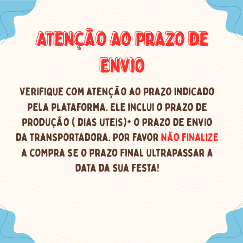 ATENÇÃO SERÁ ENVIADO O CANUDO DE ACORDO COM O ESTOQUE FAZEMOS TODOS OS TEMAS !!! ***ATENÇÃO :APÓS EFETUAR A COMPRA, NOS ENVIAR NOME E IDADE A SER PERSONALIZADOS EM ATÉ 8 HORAS, CASO NÃO ENVIE DENTRO DESSE PRAZO, ENVIAREMOS APENAS O TOPO NO TEMA ESCOLHIDO, POIS TEMOS PRAZO ESTABELECIDO PELA PLATAFORMA PARA O ENVIO..*** Prazo para Produção: até 3 dias úteis ***NÃO TRABALHAMOS COM PEDIDOS DE URGÊNCIA !!!*** Estamos à disposição para qualquer esclarecimentos, é um prazer atender e tirar todas as suas dúvidas. Agradecemos a visita e aguardamos sua compra...